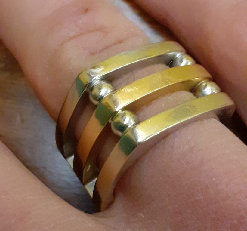 Quest’anello di forma squadrata è formato da 3 fasce unite tra loro da delle sfere.