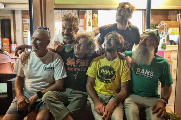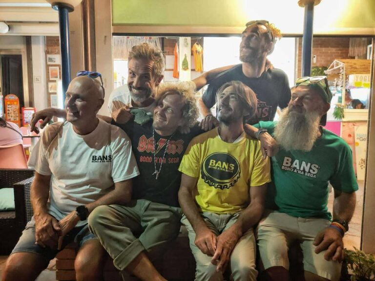 I Bans si sono ritrovati il 6 settembre a Quercianella per l’Aperibans. Quella di ieri è stata la seconda edizione dell’iniziativa e ha visto partecipare una settantina di amici che amano fare sport (“tanti sport, forse troppi” come dicono loro) e a cui piace soprattutto stare in compagni e prendersi in giro. Abbiamo chiesto ai fondatori, che ringraziamo per la disponibilità, Valerio Benetti, Massimo Petracchi, Gabriele Suardi, Emiliano Banchi, Alessio Porciani, Antonio Maressa, Francesco Balestrini, Lorenzo Rossi e Enrico Bencini qualche informazione in più sulla nascita del gruppo. “Il gruppo si è formato nel periodo del Covid su whatsapp. Non potendo andare in giro ci trovavamo per allenarci in video chiamata mentre facevamo i rulli in bici (chi sul terrazzo, chi in cantina, chi in salotto), poi dopo l’allenamento ci ricollegavamo per un video aperitivo virtuale. Il nome è nato in puro spirito livornese perché nello sport a Livorno siamo i numeri 1 nel mondo e tutti facciamo sport pensando di essere i meglio ma in realtà siamo tutti boni a’ na… ma tanto c’è sempre qualcuno più forte di noi. E da boni a’ na… abbiamo creato l’acronimo Bans che ora è un marchio registrato a tutti gli effetti. L’Aperibans? Ieri si è svolto per il secondo anno consecutivo al bar Salsedine di Quercianella (ringraziamo Giusy la titolare per l’ospitalità): è un appuntamento che abbiamo deciso di condividere con tutti i nostri amici di ogni età che impersonificano lo spirito Bans (in tutti i settori, anche non sportivi) per passare una serata in amicizia e colorare con le nostre magliette e zainetti il paese. Purtroppo questo anno siamo riusciti ad organizzarlo solo a fine estate ed eravamo solo una settantina di persone ma come si suol dire “pochi ma buoni”. Con l’occasione annunciamo che insieme ad Atletica Amaranto e a Ladies 4 FIT stiamo organizzando una raccolta fondi per l’acquisto di un defibrillatore da mettere al Gabbiano. Chiunque volesse contribuire può contattare la nostra pagina Fb”.
