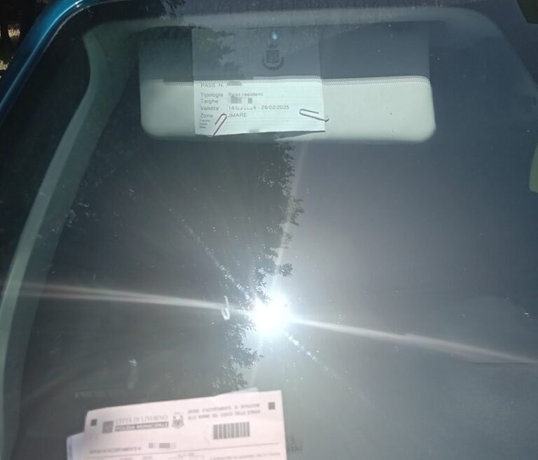 Tagliando esposto e ben visibile, come si vede dalla foto, e la cui regolarità nell’apposizione al parasole abbassato era stata da noi chiesta più volte e confermata dai vigili che vengono spesso (e fanno bene) a controllare le auto in sosta in via Goito, Zsc. Ci stavamo allontanando e nel dubbio che il parasole fosse rialzato (e quindi non visibile) siamo tornati indietro all’auto di mia moglie verificando che il parasole era abbassato e quindi il tagliando era visibilissimo. Per questa lamentela ho inoltrato protesta tramite mail alla comandante dei vigili urbani. Sul verbale che ho contestato del 17 giugno, che non intendo pagare rivolgendomi al giudice di pace, gradirei una risposta dal Comandante dei vigili anche tramite gli organi di stampa.