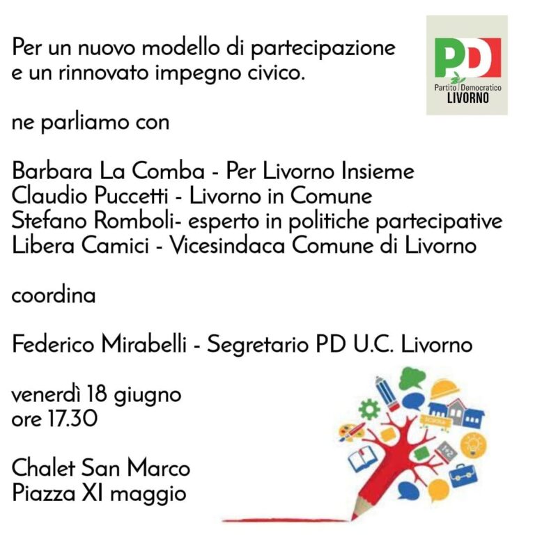 Come promuovere e organizzare la partecipazione come forma di governo del territorio? Quali funzioni nell’ambito del nuovo modello partecipativo? Quale rappresentanza e rappresentatività per favorire la libera partecipazione dei singoli cittadini e del tessuto associativo presente in un determinato quartiere? Attorno a queste domande si svilupperà il confronto durante il dibattito pubblico, coordinato da Federico Mirabelli Segretario del Partito Democratico dell’Unione Comunale di Livorno, programmato per venerdì 18 giugno dalle 17.30 allo Chalet San Marco in Piazza XI Maggio, al quale interverranno Barbara La Comba della lista civica Per Livorno Insieme, Claudio Puccetti di Livorno in Comune, Stefano Romboli in qualità di esperto di politiche partecipative e Libera Camici, vicesindaca con la delega alla partecipazione. Il tema della partecipazione sta ritrovando una nuova e diversa importanza a distanza di sette anni dal superamento delle Circoscrizioni. La loro abolizione ha comportato una riduzione significativa degli spazi civici di partecipazione della cittadinanza alla vita della città aumentando inoltre la distanza con l’Amministrazione Comunale. Le forze di maggioranza, per questo motivo, hanno presentato in Consiglio Comunale un atto di indirizzo affinché si possa aprire una fase costituente per ricostruire un modello di partecipazione funzionale alle complessità presenti in una città di medie dimensioni come Livorno. Il Consiglio Comunale, approvando all’unanimità l’atto promosso dalle forze di maggioranza, ha avviato un percorso che dovrà vedere necessariamente coinvolte tutte le forze politiche, il mondo associativo e i cittadini e noi come Partito Democratico daremo un contributo concreto in questa direzione.