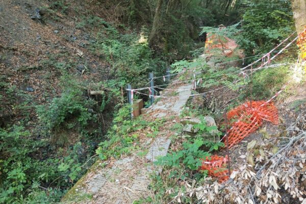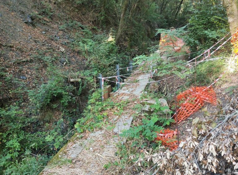 La mattina del 19 settembre ho inviato una mail con foto al sindaco Salvetti e al presidente della Regione Toscana Giani per segnalare che alcuni metri dell’acquedotto Leopoldino sono parzialmente franati. L’area è recintata alla meno peggio e il muro è sostenuto da alcuni pali di ferro di cui uno è legato con un cavo d’acciaio a un albero.