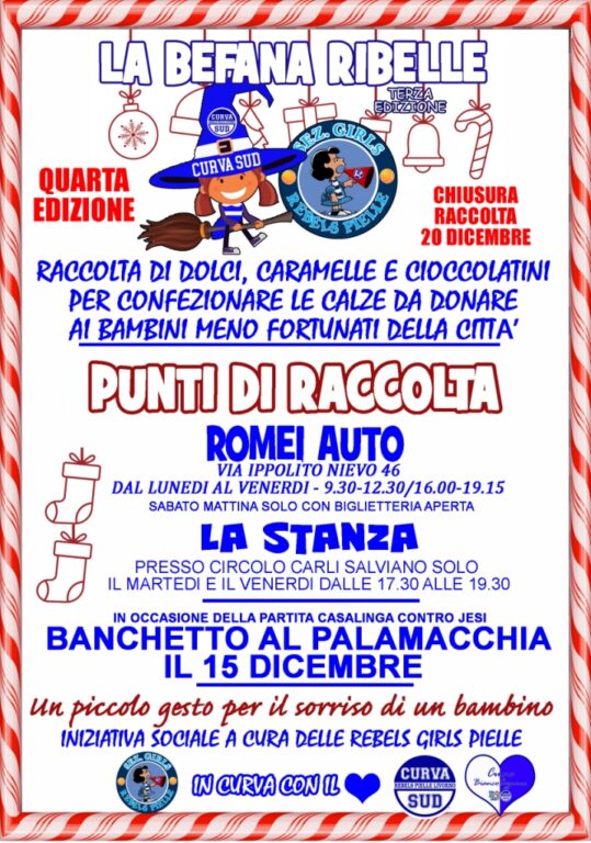 L’iniziativa, promossa da Rebels Girls Pielle con il sostegno di tutta la Curva Sud, consiste nella raccolta di caramelle, dolcetti, cioccolatini per riempire centinaia e centinaia di calze da donare ai bambini meno fortunati tramite Appartenenza Labronica, Pediatria Livorno, Caritas e Chiesa dei Cappuccini