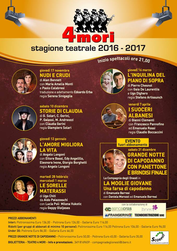 “Alcuni degli spettacoli della nuova stagione – continua Barresi – ci sono stati suggeriti dal pubblico e abbiamo preso come spunto lo spettacolo che nella scorsa stagione ha avuto più successo, intitolato “Due partite”, e gli altri graditi dal pubblico, per stilare la nuova stagione. Per creare il cartellone di quest’anno ho cercato di basarmi sulle preferenze degli spettatori e dar vita qualcosa che somigliava, per il tipo di motivazione che stava dietro all’allestimento, agli spettacoli precedenti. La prima rappresentazione della stagione, intitolata “Nudi e crudi”, sarà il 17 novembre e vedrà la partecipazione di Maria Amelia Monti e Paola Calabresi, due attori molto bravi, così come l’autore, Edoardo Erba, uno dei più importanti autori teatrali. In seguito si susseguiranno il 10 Dicembre “Storie di Claudia”, con Claudia Gerini, il 12 Gennaio “L’amore migliora la vita”, con Ettore Bassi, poi ci saranno due serate, il 28 Febbraio e il 1 Marzo, con lo spettacolo “Le sorelle Materassi”, con Lucia Poli e Milena Vokotic. Si prosegue con “L’inquilina del piano di sopra” il 16 Marzo e per finire il 7 aprile avremo come finale di stagione “I suoceri Albanesi” con Francesco Pannofilo ed Emanuela Rossi. Inoltre sabato 31 Dicembre ci sarà uno spettacolo per la notte di Capodanno, una farsa intitolata “La moglie giovane”, organizzata dalla nostra compagnia, e con panettone e brindisi finale. Volevo inoltre ricordare che dal 24 al 31 luglio invece, alla Fortezza Vecchia, ci saranno “Le Stanze Livornesi”, un altro spettacolo organizzato dalla Compagnia degli Onesti”.