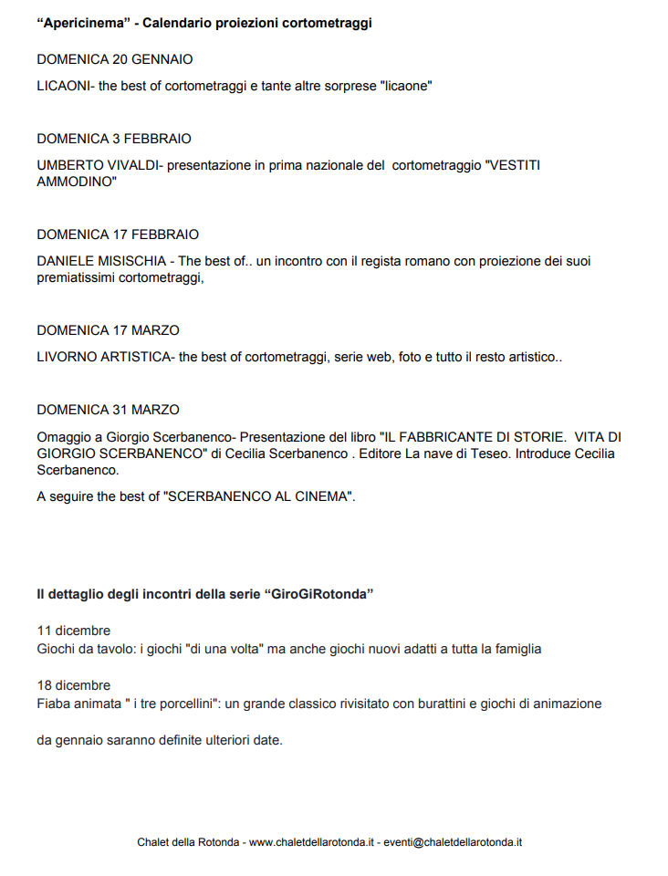 “Rotonda Unplugged” vedrà alternarsi le Tribute band dei più grandi cantautori italiani e internazionali. Dai Beatles ai Green Day, passando per Jovanotti, Zucchero, Ed Sheeran, Nirvana e Max Pezzali. Tutte le serate saranno in versione acustica, con il pubblico a stretto contatto con i musicisti. Sono previsti 10 appuntamenti domenicali, fino a marzo, dalle 18 in poi, con musica e cocktail. Da gennaio 2019 l’appuntamento domenicale con Rotonda Unplugged si alternerà con “Apericinema”, una rassegna di cortometraggi indipendenti realizzata grazie alla preziosa collaborazione del FI-PI-LI Horror Festival di Livorno. La proiezione sarà accompagnata da interventi degli autori e personaggi del mondo del cinema indipendente (non soltanto a tema Horror). Sono previsti cinque appuntamenti, con inizio alle 18, dopo i quali saranno proiettati alcuni dei migliori cortometraggi del panorama nazionale. In aggiunta alle iniziative culturali e agli eventi delle varie rassegne, lo Chalet della Rotonda ha dato vita ad una speciale collaborazione con il Teatro Goldoni di Livorno. Oltre ad ospitare alcune presentazioni delle opere e spettacoli della Stagione, da Gennaio partirà la promozione “Sipari & Sapori” con la quale lo Chalet vuole dare il suo contributo per incentivare il teatro livornese.