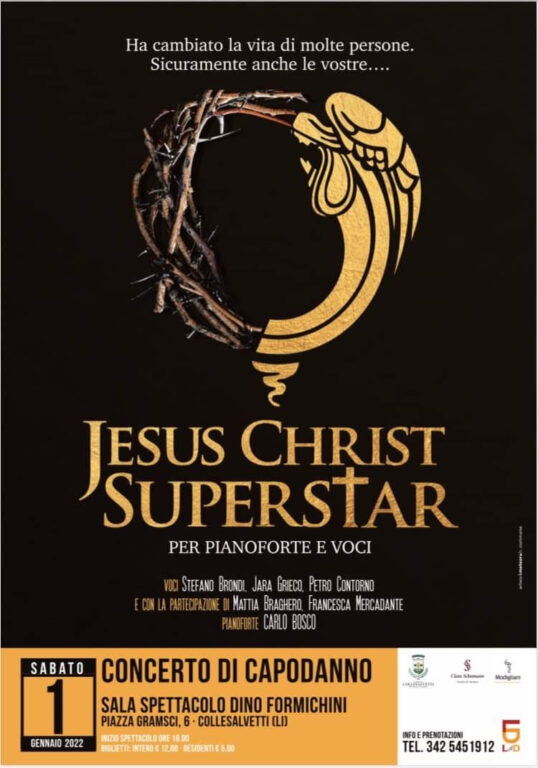 Alle 18 di sabato 1 gennaio sarà di scena l’opera rock Jesus Christ Superstar, scritta da Andrew Lloyd Webber e Tim Rice e ispirata all’ultima settimana di vita di Gesù. Nel 1973 uscì la versione cinematografica dell’opera. Voci soliste saranno Stefano Brondi, Jara Grieco e Pietro Contorno supportate dai cori di Mattia Braghero e Francesca Mercadante. Al pianoforte Carlo Bosco. L’ingresso, consentito solo ai possessori di Green pass e di mascherina FFP2, sarà di euro 12 per i non residenti e di euro 5 per i residenti del Comune di Collesalvetti. Consigliata la prenotazione al 342 5451912.