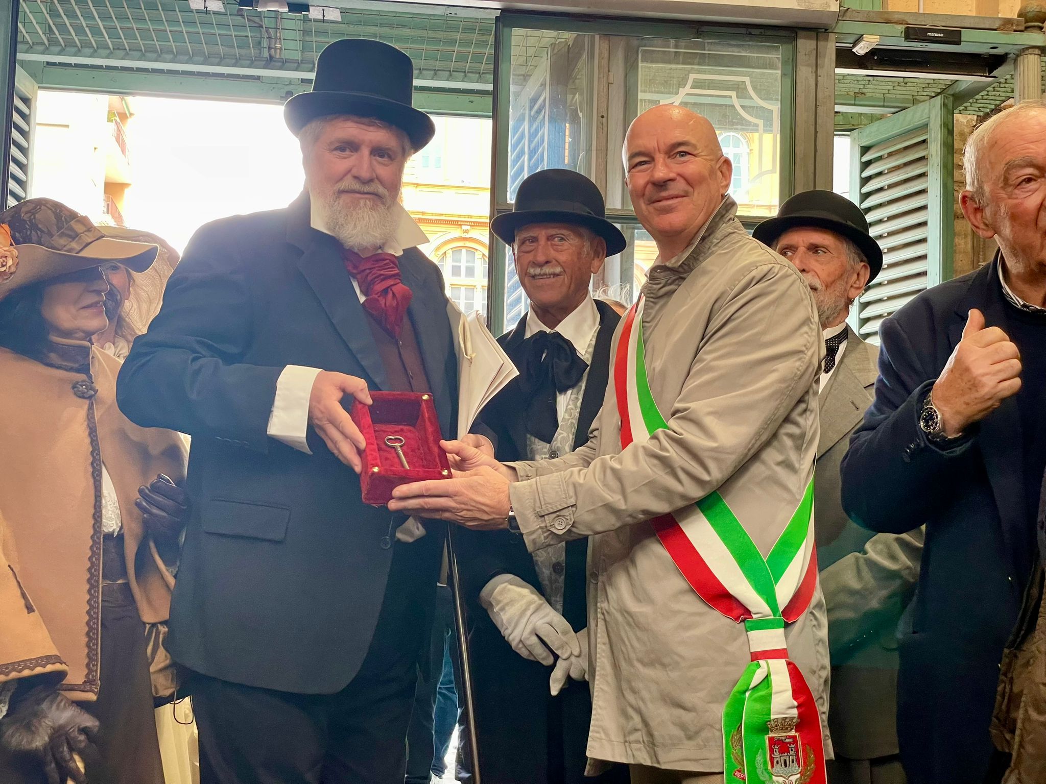 Il progettista, arch. e ing. Angiolo Badaloni, interpretato da uno dei figuranti, ha tagliato il nastro simbolico e consegnato le chiavi del Mercato al sindaco Salvetti, come nel 1894 furono consegnate all’allora sindaco, rivivendo così il gesto dell’inaugurazione