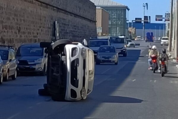 Auto ribaltata su un fianco in via della Cinta Esterna. E’ accaduto intorno alle 11,30 del 20 settembre. Sul posto la polizia municipale.
