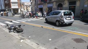 Grave incidente quello che si è verificato intorno alle 13,45 in via Garibaldi all’altezza del numero civico 93. Una donna alla guida della sua auto, una Mercedes grigia, stava uscendo a retromarcia dal parcheggio a lisca di pesce quando stava sopraggiungendo un giovane di 24 anni alla guida della sua moto. Lo schianto è stato violento tanto da far saltare in aria tutti i vetri del lunotto posteriore della macchina. Il motociclista è stato sbalzato dalla sua sella ed è terminato riverso sul marciapiede. L’enorme boato ha fatto accorrere numerosi residenti della zona i quali hanno fatto partire la macchina dei soccorsi.