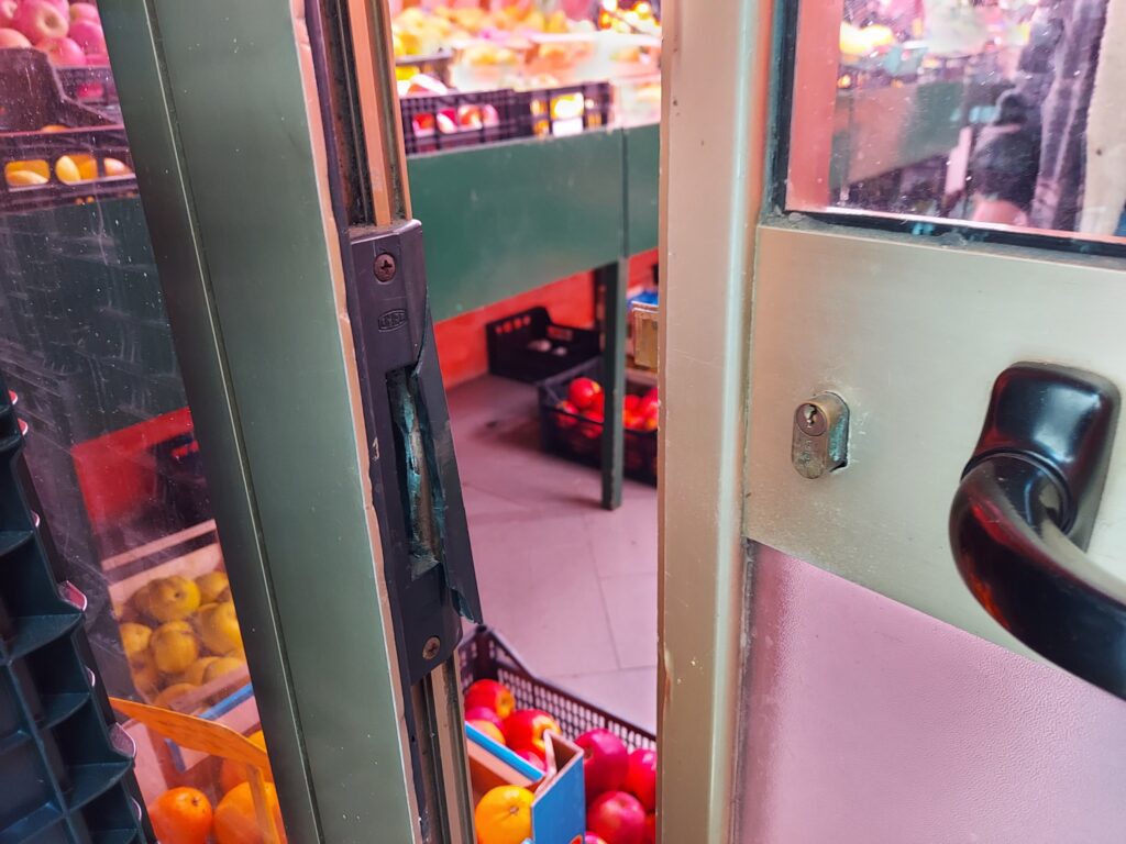 I ladri hanno scassinato la serratura (nella foto) della porta a vetri d’ingresso e, una volta dentro, si sono recati a botta sicura verso il registratore di cassa. All’interno hanno rubato solo i pochi spiccioli contenuti e conservati dalla sera precedente per i primi resti da fare al mattino seguente.