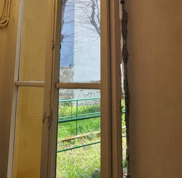 L'infisso della porta finestra sradicato dal ladro durante la fuga nella foto del referente della palestra, Mirko, che ringraziamo per la disponibilità