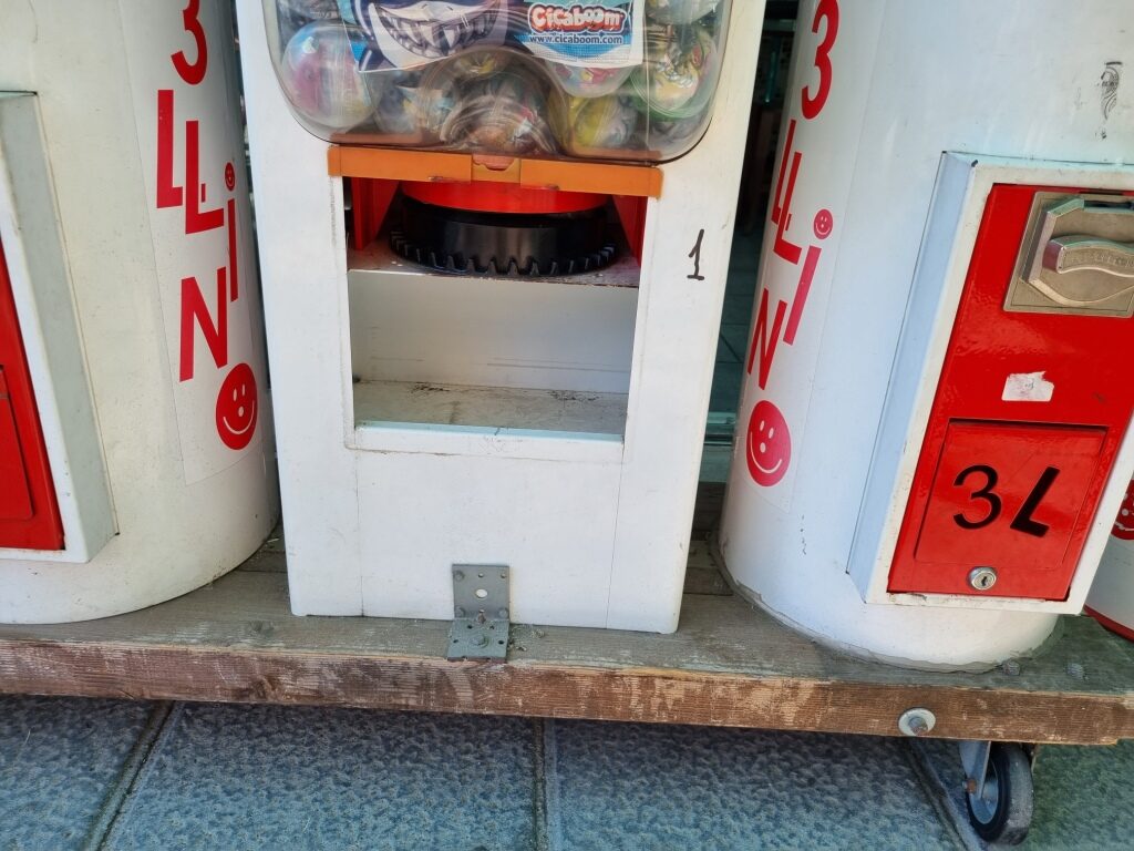 Nella foto il vetro infranto della baracchina Il Delfino e la macchinetta per bambini da dove è stata asportata la gettoneria