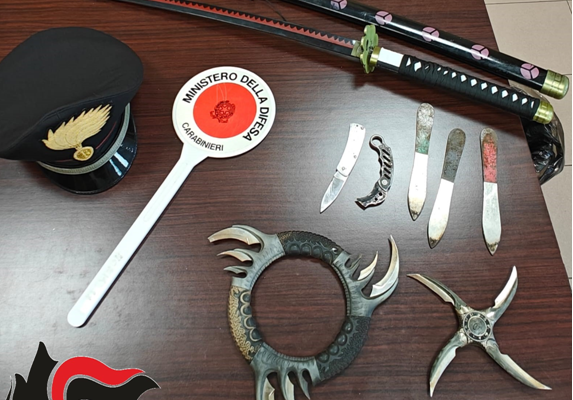 Katana, 5 coltelli, 1 shuriken e 1 arma da lancio. Denunciati per porto abusivo