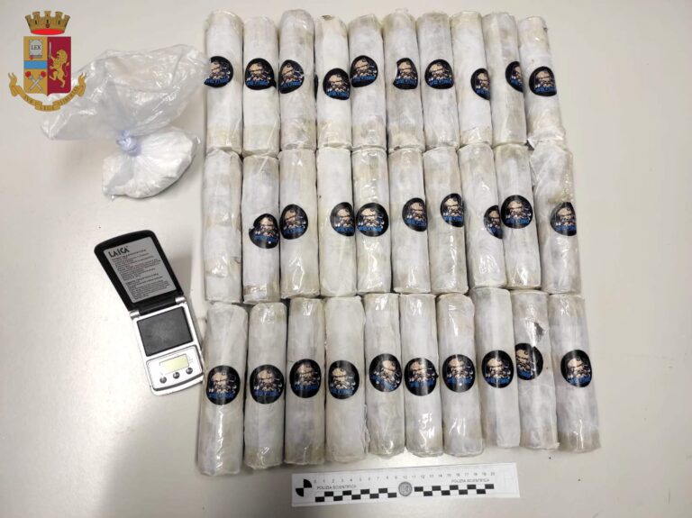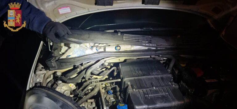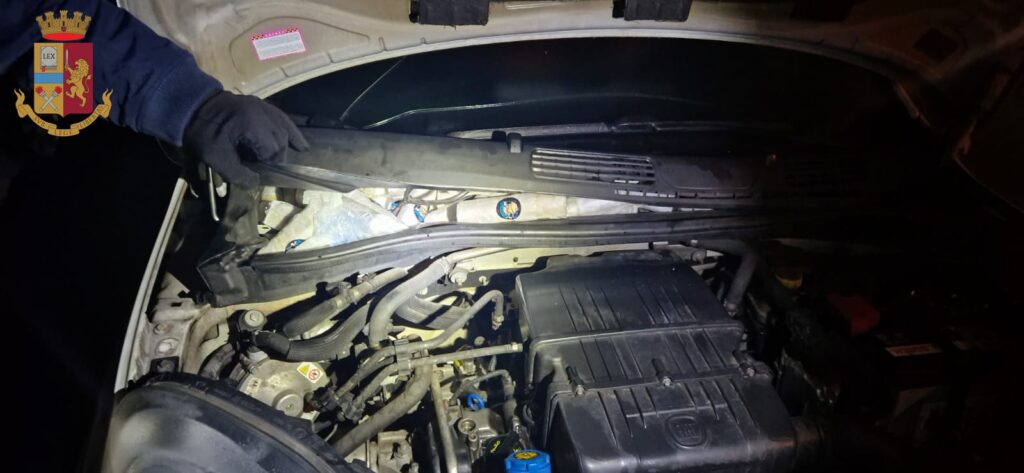 Sottoposto al controllo di Polizia, è stato trovato in possesso di una chiave riconducibile proprio all’autovettura. Una volta aperta la portiera, i poliziotti sentivano subito un forte odore di sostanza stupefacente provenire dal gruppo di ventilazione del cruscotto, pertanto procedevano all’immediata perquisizione del mezzo, che dava esito positivo, in quanto sono stati trovati, occultati nel vano motore (sotto la griglia dove sono presenti i tergicristalli), confezionati e già pronti per essere immessi sul mercato, ben 6 kg di hashish (divisi in 30 “cilindri” col marchio impresso sul cellophane) ed un etto di cocaina (in una busta trasparente).