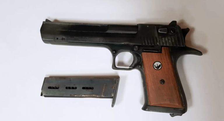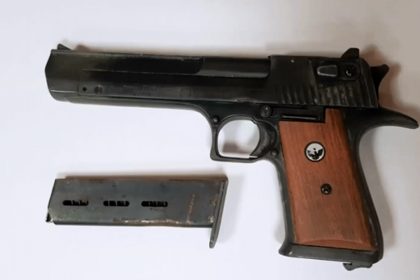 Nella foto la pistola scacciacani in metallo fedele riproduzione del ben noto modello Desert Eagle, scrive l'Arma