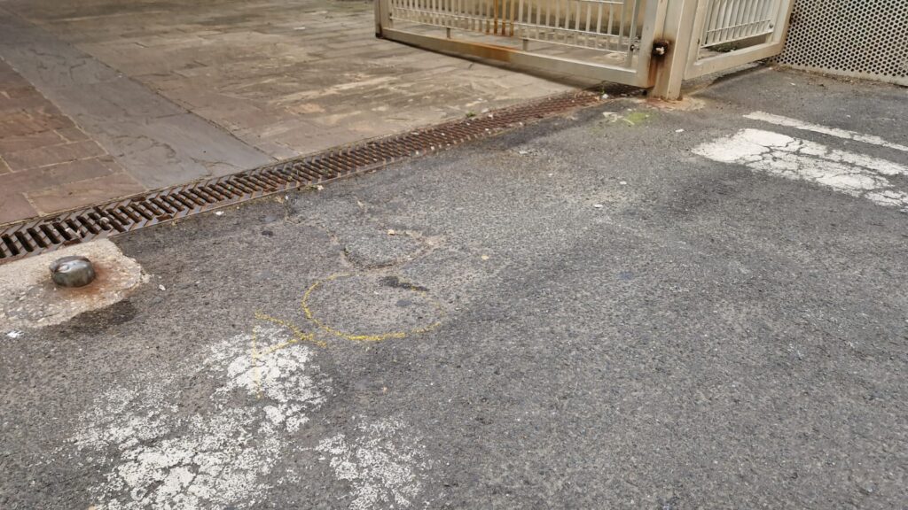 Nel cerchietto il punto sull'asfalto nel quale è stato trovato il bossolo esploso dal malvivente prima della fuga