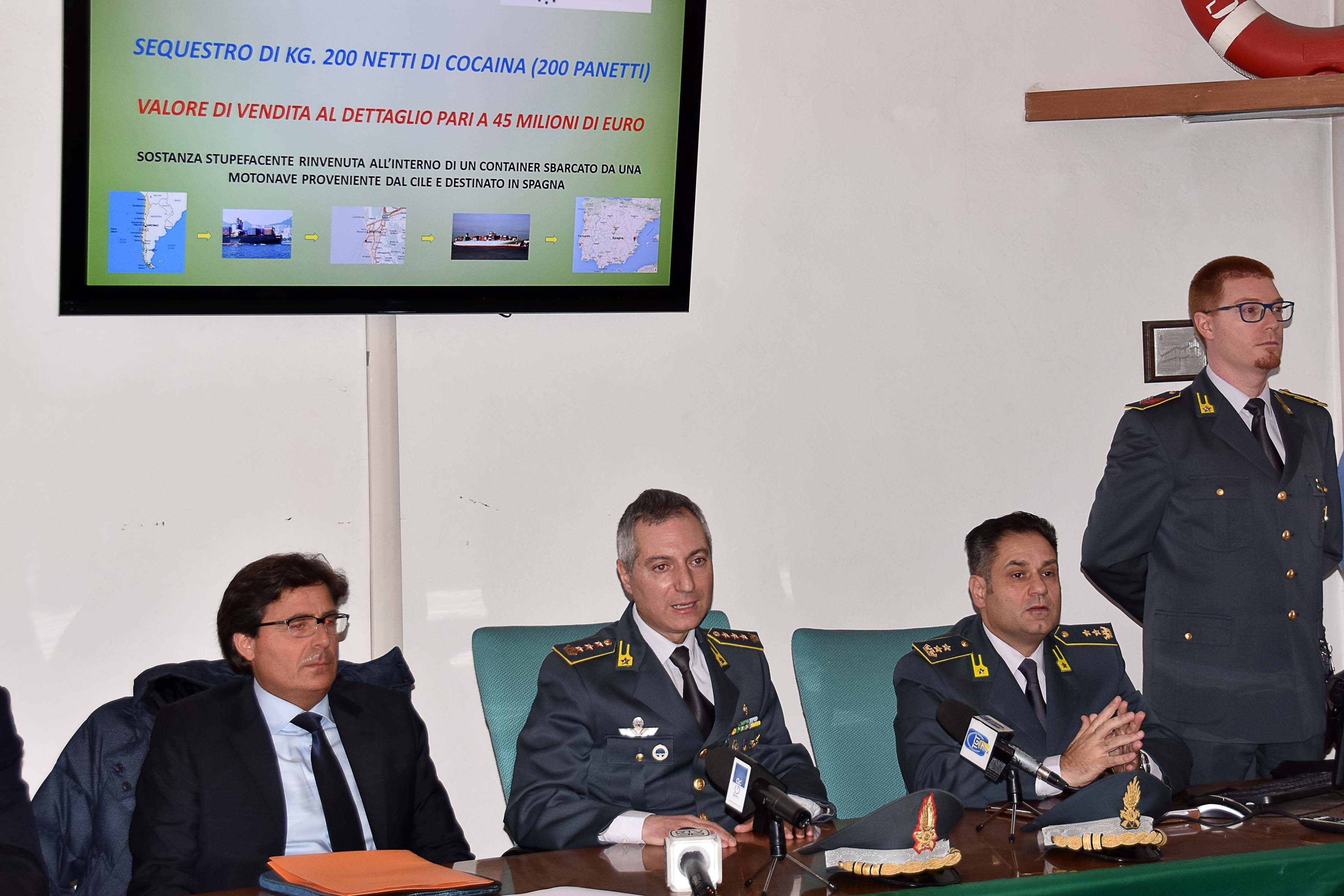 Il quantitativo, suddiviso in 200 panetti, era occultato in quattro borsoni presenti in un container, con all'interno materiale scenografico teatrale, arrivato in porto proveniente dal Cile e destinato in Spagna