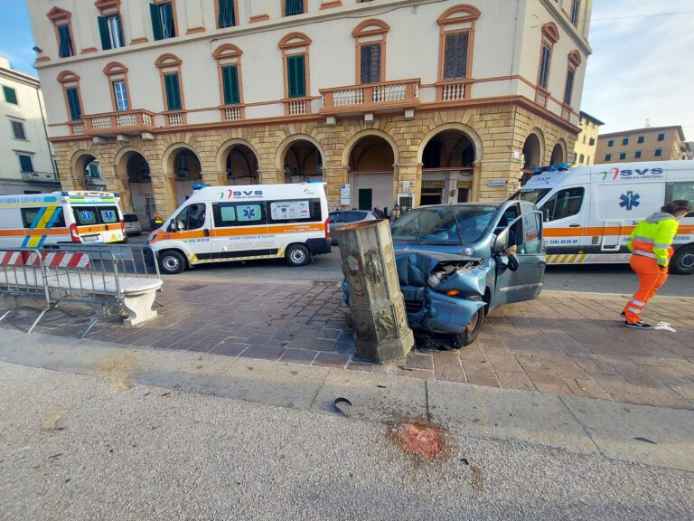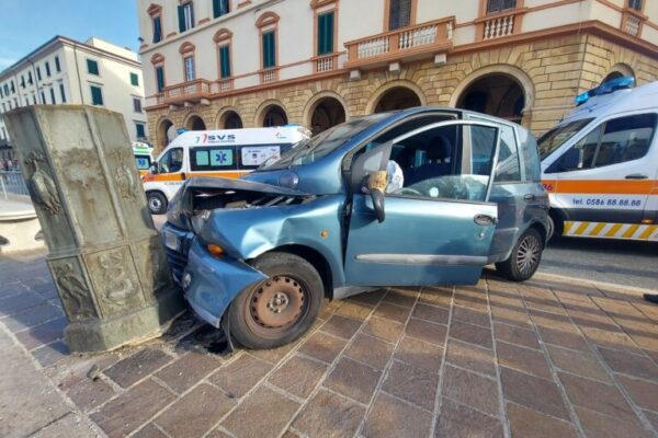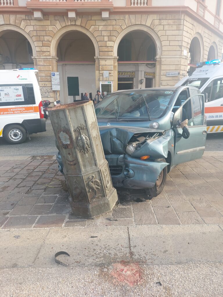Nelle foto di proprietà della redazione di QuiLivorno.it (e soggette a copyright e di cui è vietata la riproduzione su social o altri siti se non previa autorizzazione) si vede la Fiat finita contro il pilone in piazza della Repubblica e le ambulanze intervenute per i soccorsi