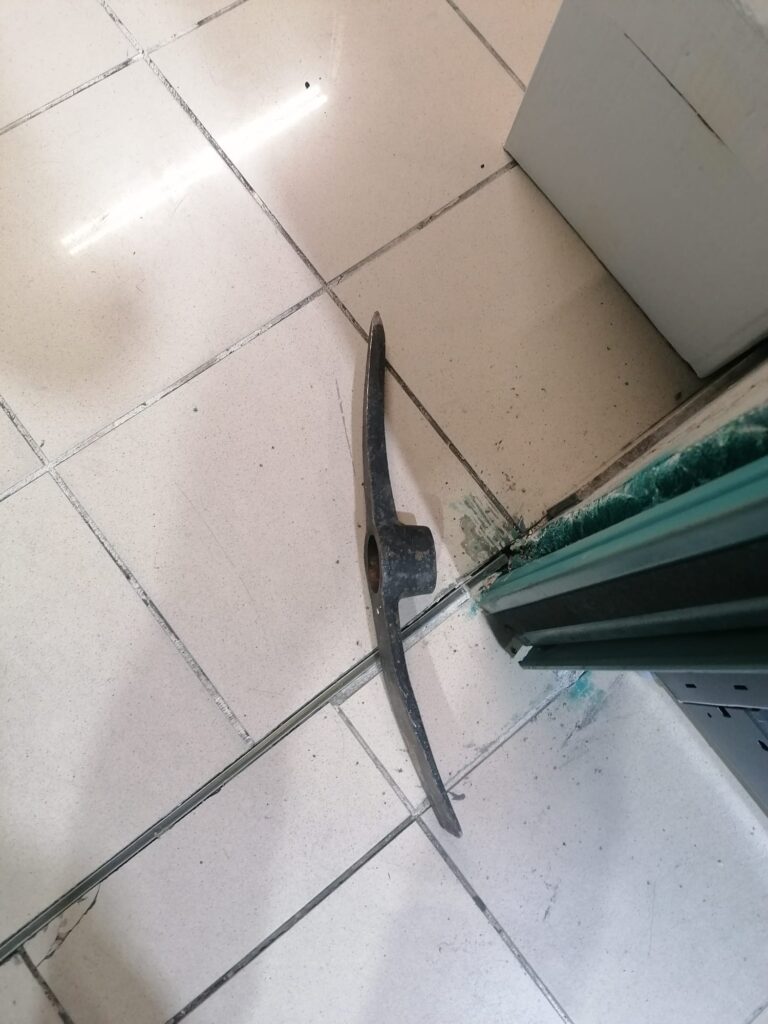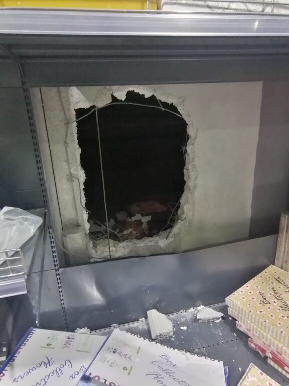 Sul luogo del furto sono stati trovati, vicino alla porta, sia la testa di un piccone sia due bastoni, evidentemente utilizzati per procurarsi l’accesso all’interno del negozio.