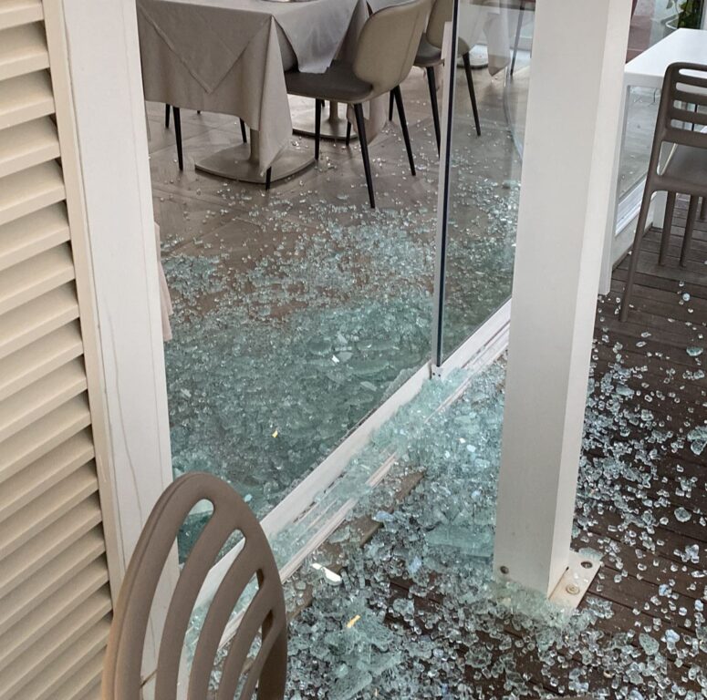 Nella foto la vetrata infranta del ristorante della Baracchina Bianca