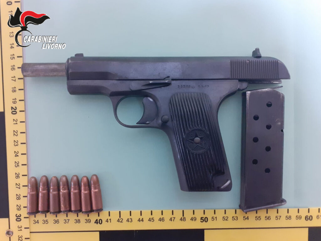 L’estate livornese non è calda solo per le alte temperature registrate sui termometri negli ultimi giorni. Infatti, i carabinieri del Nucleo Investigativo del Comando Provinciale, nel corso di una recente attività di polizia giudiziaria, condotta d’iniziativa, hanno arrestato un uomo di nazionalità albanese sorpreso in possesso di una pistola di fabbricazione russa, marca Tokarev modello T33 calibro 7,62×25 mm (cd. calibro Makarov) con sette colpi inseriti nel caricatore, pronta all’uso. Durante l’operazione, i militari hanno inoltre denunciato in stato di libertà un altro cittadino albanese in compagnia del primo, trovato in possesso di arma impropria: un manganello retrattile in acciaio. Complessivamente sono state sottoposte a controllo tre persone. L’operazione, come si legge in una nota stampa dei carabinieri, si è conclusa all’interno di un noto esercizio commerciale a Stagno, luogo in cui il Nucleo Investigativo ha fatto irruzione immobilizzando i tre sospetti, subito dopo sottoposti a perquisizione personale e veicolare. Sul posto, in supporto agli operanti, sono sopraggiunti due equipaggi del Nucleo Radiomobile in forza al Comando della Compagnia Carabinieri labronico.