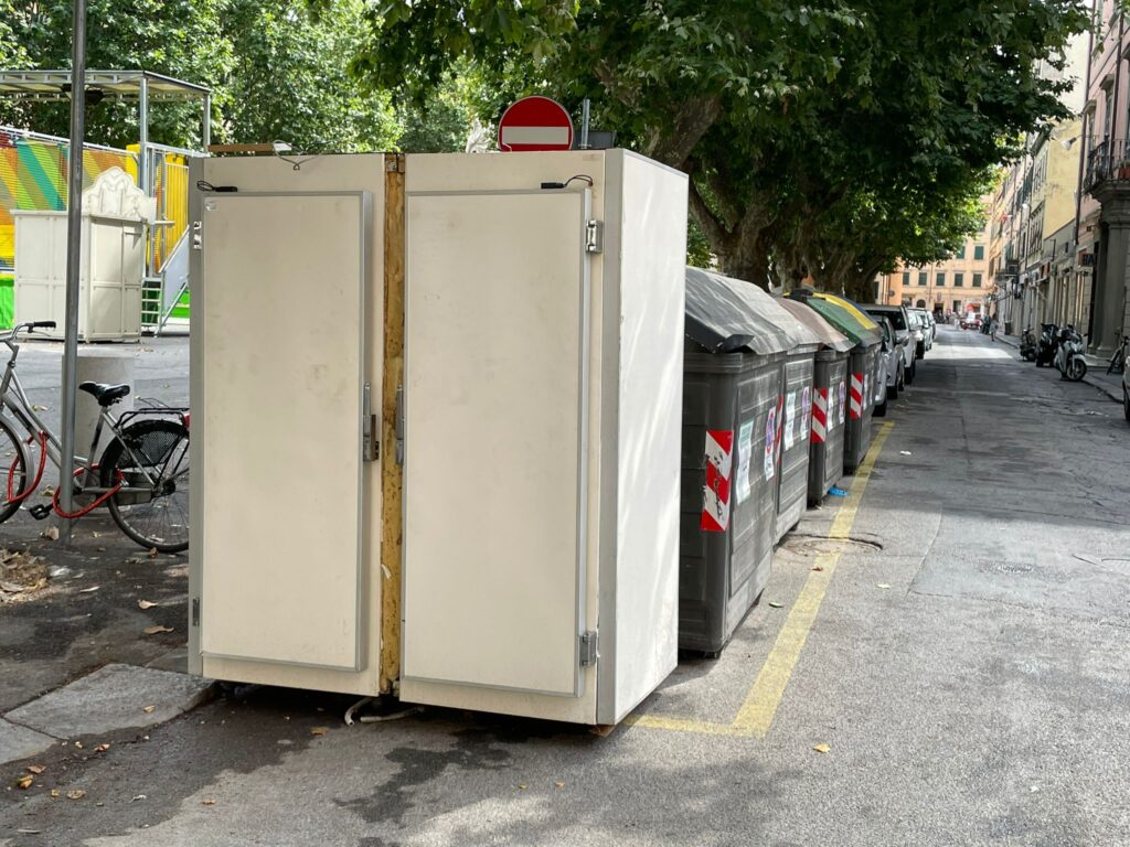 Un frigorifero industriale è stato abbandonato mercoledì 14 luglio ai cassonetti in piazza XX Settembre, lato via Gazzarrini (foto Ufficio Stampa Comune di Livorno).