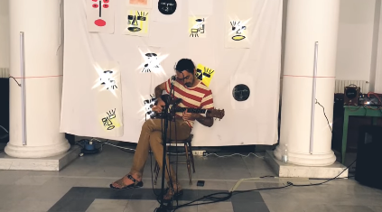 Fermo immagine tratto dal video del sound check di Nicola Vukich per “La via dell’Arte” nel foyer del Centro Artistico Il Grattacielo (agosto 2020)