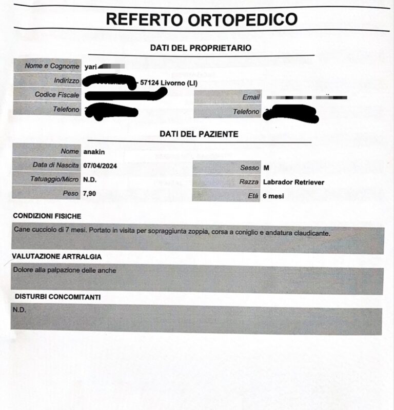 Anakin e il referto ortopedico inviato da Yari, il padrone, che ringraziamo per la disponibilità