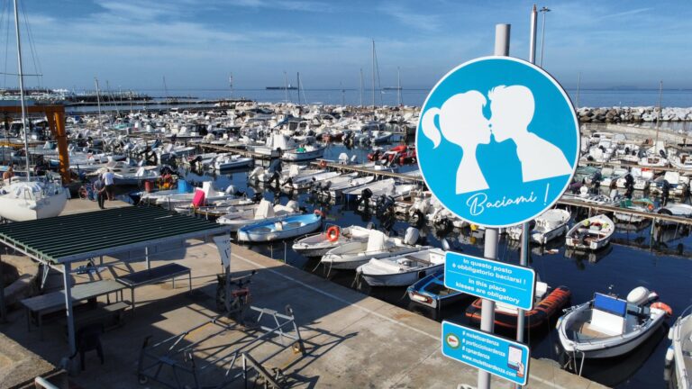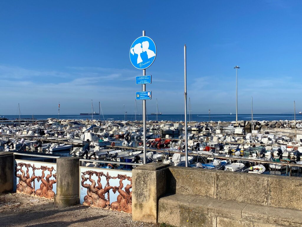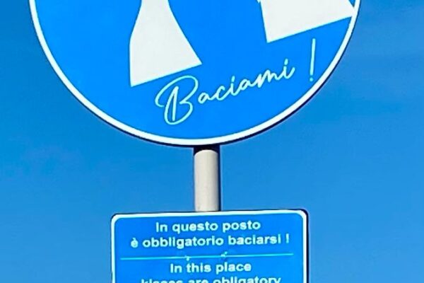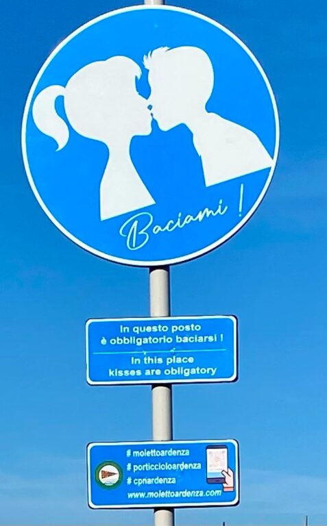 E allora perché non prendere la palla al balzo e rendere ancora tutto più romantico suggellando il momento con un bel cartello che inviti a darsi un bacio davanti al testimone muto che altro non è che il nostro mare? Più che un invito un vero e proprio “obbligo” suggellato da tanto di cartellonistica blu con la figura di una coppia intenti a darsi un bacio sulle labbra e la scritta “Baciami!”.
