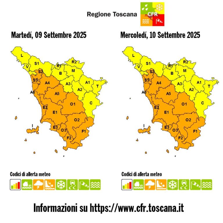 La sala operativa della Protezione civile regionale ha emesso un codice arancione su gran parte della Toscana per temporali e piogge diffuse da martedì 9 settembre alle 17.00 fino alle 13.00 di mercoledì 10 settembre a causa di una perturbazione atlantica che sta transitando sulla nostra regione. Nello specifico: il codice arancione interessa le zone costiere e occidentali (province di Lucca, Pisa, Livorno, Grosseto e parti ovest delle province di Firenze e Siena). Saranno possibili anche grandinate e colpi di vento. Il maltempo fa permanere il codice giallo nelle altre aree della Toscana fino alla mezzanotte di domani, mercoledì, con la possibilità di temporali localmente anche forti. Ulteriori dettagli e consigli sui comportamenti da adottare, a seconda del rischio, si trovano all’interno della sezione Allerta meteo del sito della Regione Toscana, accessibile all’indirizzo http://www.regione.toscana.it/allertameteo.