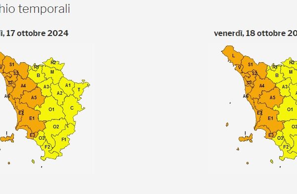 Un codice giallo per rischio idraulico del reticolo principale (dalle 16 di oggi alle 14 di domani) riguarda le zone a nord-ovest e quelle centrali in corrispondenza delle province di Pisa, Livorno e Grosseto. Infine un altro codice giallo, sempre per rischio idrogeologico e idraulico del reticolo minore e temporali forti (dalle 16 di oggi alle 7 di domani) riguarda le altre zone non interessate dal codice arancione (zone interne, da nord a sud).