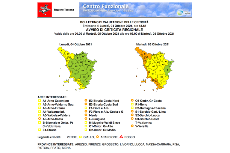 E’ atteso forte maltempo dalle prossime ore con temporali e rischio idrogeologico idraulico del reticolo minore (criticità di colore giallo) a partire dalle 17 del 4 ottobre fino a mezzanotte, con ulteriori peggioramento durante la notte che faranno salire l’allerta al colore arancio. La Protezione Civile Regionale ha infatti emesso in queste ore un bollettino di allerta arancio per temporali forti e rischio idrogeologico idraulico del reticolo minore valido dalla mezzanotte fino alle 6 di martedì 5 ottobre. Poi dalle 6 alle 10 da allerta arancio si tornerà a criticità gialla.