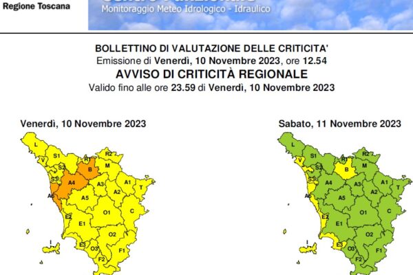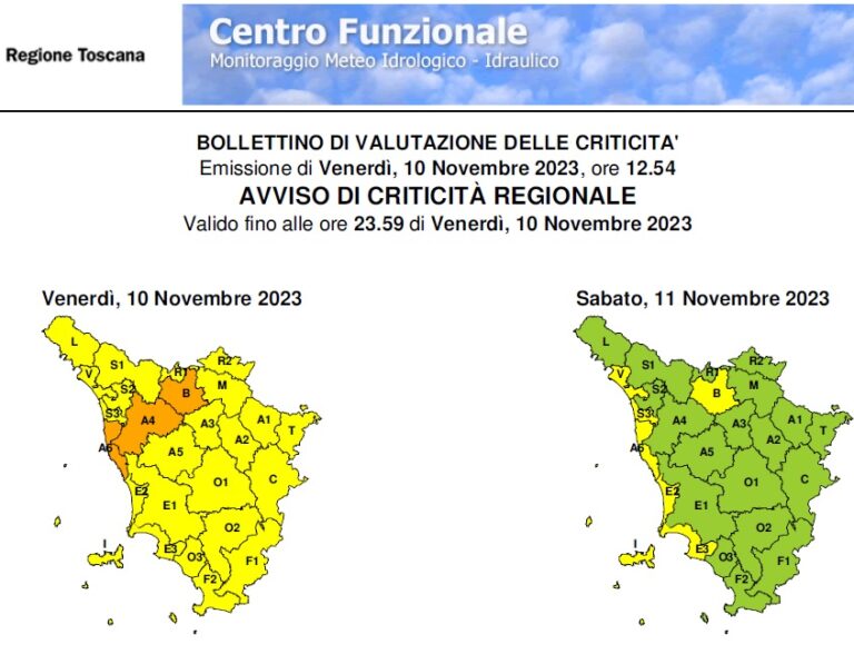 Questa la situazione aggiornata delle criticità dopo la pubblicazione del bollettino del 10 novembre del Centro funzionale meteo della Protezione civile regionale. Innanzitutto per Livorno e Gorgona l’allerta arancione per rischio idrogeologico e idraulico del reticolo minore è prolungata fino alla mezzanotte (ore 23.59) di venerdì 10 novembre e fino alla fine dell’allerta arancione, come da ordinanza, rimangono chiuse tutte le scuole, ludoteche e servizi educativo-scolastici pubblici e privati, centri diurni, parchi, cimiteri, campo scuola e canile comunale. Per quanto riguarda il rischio vento e mareggiate, per Livorno e Gorgona il codice giallo è prolungato fino a mezzogiorno di sabato 11 novembre per forti venti dai quadranti occidentali. Nessuna criticità significativa è segnalata per Livorno e Gorgona riguardo al rischio di forti temporali (codice verde dunque), anche se il bollettino della Protezione civile regionale prevede un aumento dell’instabilità con possibilità di rovesci e temporali su tutta la Toscana.