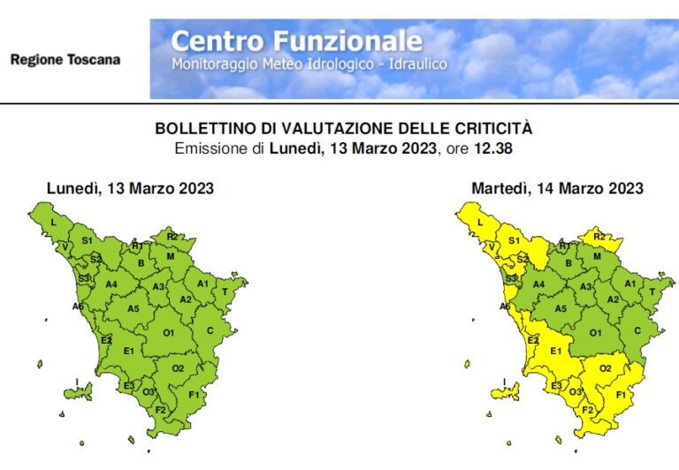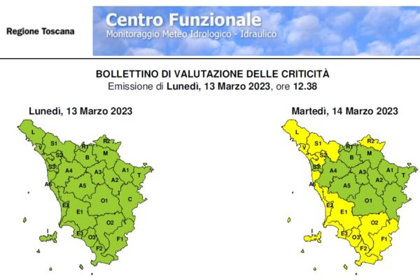 Il Centro funzionale meteo della Protezione civile regionale ha emesso per la giornata di martedì 14 marzo un avviso di criticità in codice giallo riguardante quasi tutto il versante occidentale della Toscana, per il previsto transito di una veloce perturbazione da nord-ovest con piogge sparse, vento forte e mare molto mosso. Il vento inizialmente soffierà da sud-est con successiva rotazione a libeccio, con raffiche in intensificazione fino a 80-100 km/h. Per Livorno e Gorgona sarà in vigore il codice giallo per vento dalla mezzanotte di lunedì 13 marzo fino alle 17 di martedì 14 marzo e il codice giallo per mareggiate dalle 12 di martedì 14 marzo fino alla mezzanotte (ore 23.59).