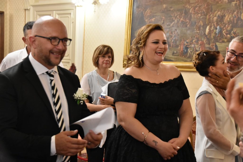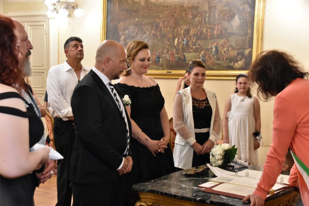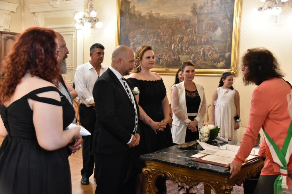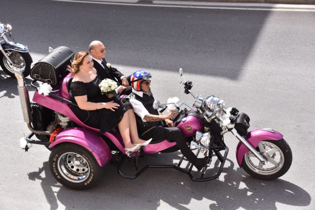 La sposa, bellissima nel suo atipico ed elegante vestito nero, è stata accompagnata in piazza del Municipio dal padre che, insieme a lei, a bordo di un triker color rosa (una particolarissima moto a tre posti) ha condotto la sposa, come da tradizione, fin sotto alla scalinata del Comune prima e, dopo, alla sala cerimonie di Palazzo Civico dove si è svolta ufficialmente la cerimonia che ha visto unire in matrimonio la coppia. Testimone d’eccezione il figlio di due anni e mezzo vestito tale e quale al padre.