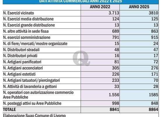 “I dati ufficiali dell’ufficio Suap (Sportello Unico per le Attività produttive) sono chiari, Livorno sul fronte delle attività commerciali attive in città è in controtendenza con il resto delle grandi città toscane e italiane. Nel 2022 le attività aperte erano 8841 nel 2025 dopo 4 anni il numero di realtà aperte è di 8864.
