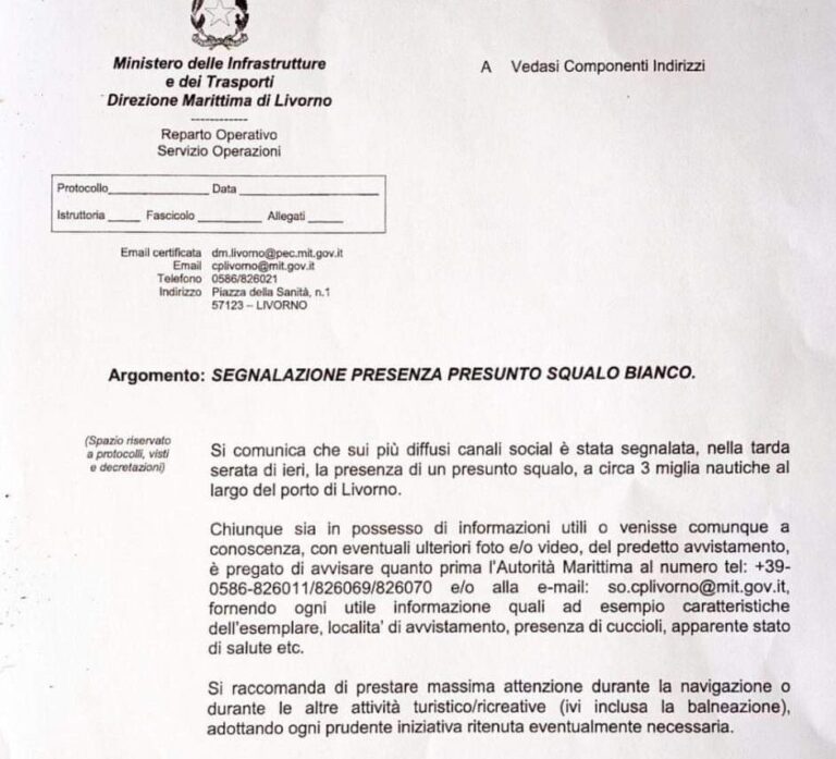 L’avvistamento di un presunto squalo bianco a circa 3 miglia nautiche al largo del porto di Livorno ha portato la Direzione Marittima di Livorno a inviare una comunicazione a tutti i circoli nautici: “Chiunque sia in possesso di informazioni utili o venisse a conoscenza con eventuali foto e video dell’avvisamento avvisi quanto prima l’autorità marittima al numero 0586 826011/826069/826070 e/o alla mail [email protected] fornendo ogni utile informazioni come caratteristiche dell’esemplare, presenza di cuccioli, località avvistamento, apparente stato di salute”. Inoltre nella comunicazione si raccomanda di “prestare la massima attenzione durante la navigazione o durante altre attività compresa la balneazione”.