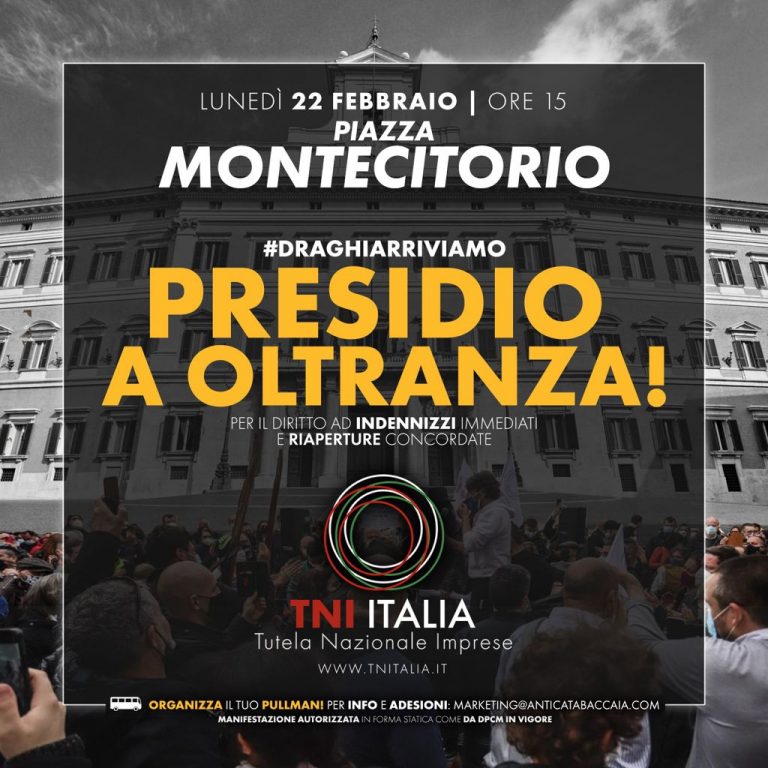Sono in partenza da Firenze, Grosseto, Arezzo, Pistoia, Livorno, ma anche da Volterra, Ancona, Foggia, Genova, Verona, Milano, solo per fare qualche esempio. Gli imprenditori di tutta Italia, da Nord a Sud, qualcuno con i mezzi propri altri con i pullman, raggiungeranno piazza Montecitorio a Roma per partecipare alla manifestazione rilanciata sui social sotto l’hashtag #draghiarriviamo e promossa da TNI-Tutela Nazionale Imprese-Ristoratori Toscana, l’associazione che rappresenta 40mila imprese in Italia. Sarà un presidio a oltranza, pronti a montare le tende davanti a Montecitorio fino a quando non ci saranno risposte da parte del governo Draghi.