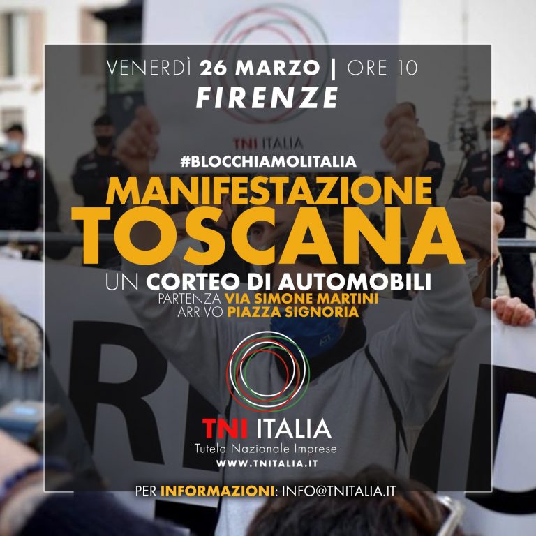 Scendono in piazza venerdì 26 marzo, lanciando l’hashtag #blocchiamolitalia, le imprese di TNI Horeca Italia, che hanno deciso di unirsi ai tassisti e ai commercianti per una manifestazione nazionale di protesta contro le misure insufficienti messe in campo dal Governo Draghi. La mobilitazione coinvolgerà diverse città italiane: Torino, Roma, Napoli e anche Firenze, dove un corteo mobile di taxi e mezzi privati partirà alle 10 da via Simone Martini per concludersi in piazza Signoria.