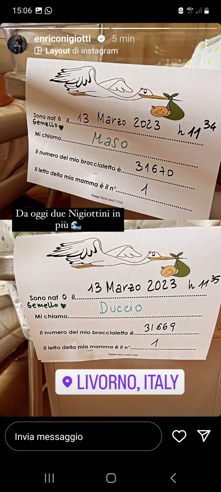 Benvenuti Maso e Duccio. Sono nati nel reparto di Ostetricia di Livorno i gemelli di Enrico Nigiotti e Giulia. Ad annunciarlo è stato il cantante intorno alle 15 attraverso un post e una storia sul proprio profilo Instagram. Maso è venuto alla luce alle 11.34 e Duccio alle 11.35, sempre come da (seconda) storia Instagram dell’artista livornese. Congratulazioni ai neo genitori. Nel post Nigiotti ha scritto una bellissima dedica che inizia così “Benvenuti nel chiasso mondo bimbetti miei…” e si conclude così: “Siete il giorno più bello della mia vita. Per tutta la mia vita. Il vostro babbo”.