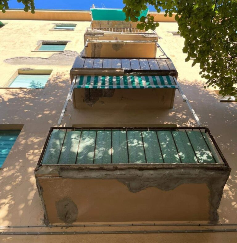 È accaduto in un cortile in via Giovanni Giolitti dove, da un terrazzo di un palazzo di edilizia popolare, è caduto al suolo un pezzo danneggiando gravemente un'auto in sosta