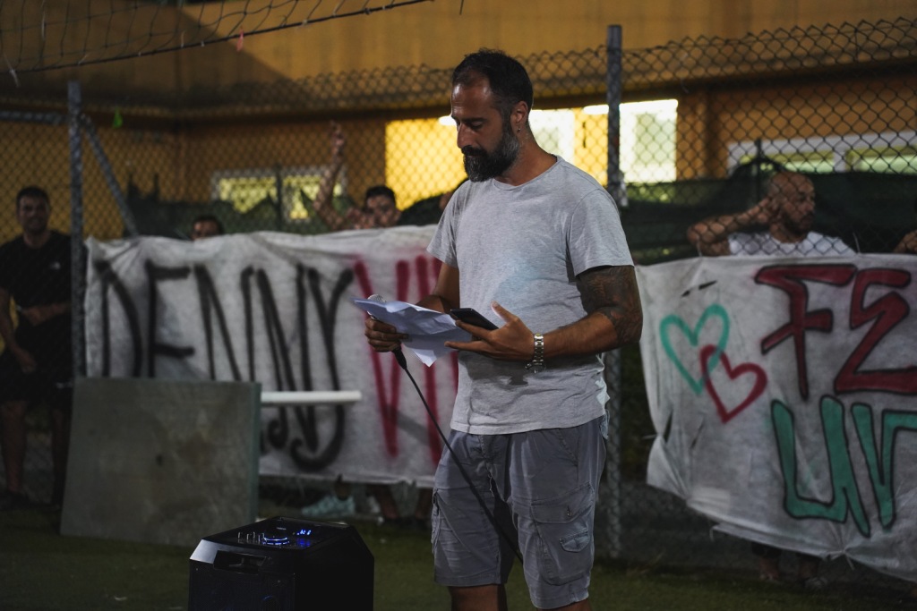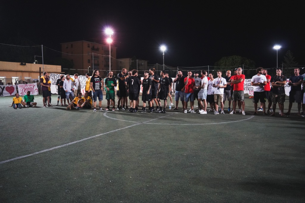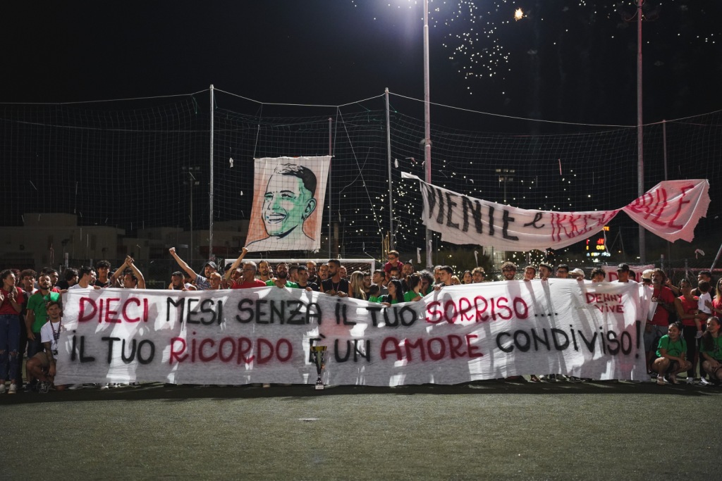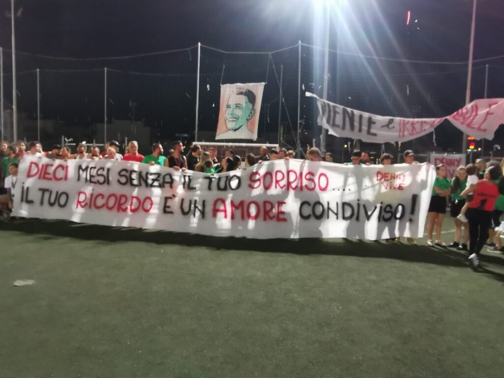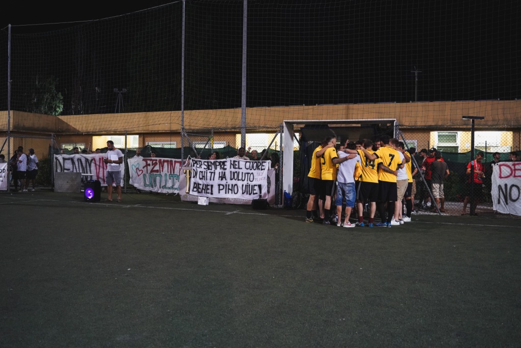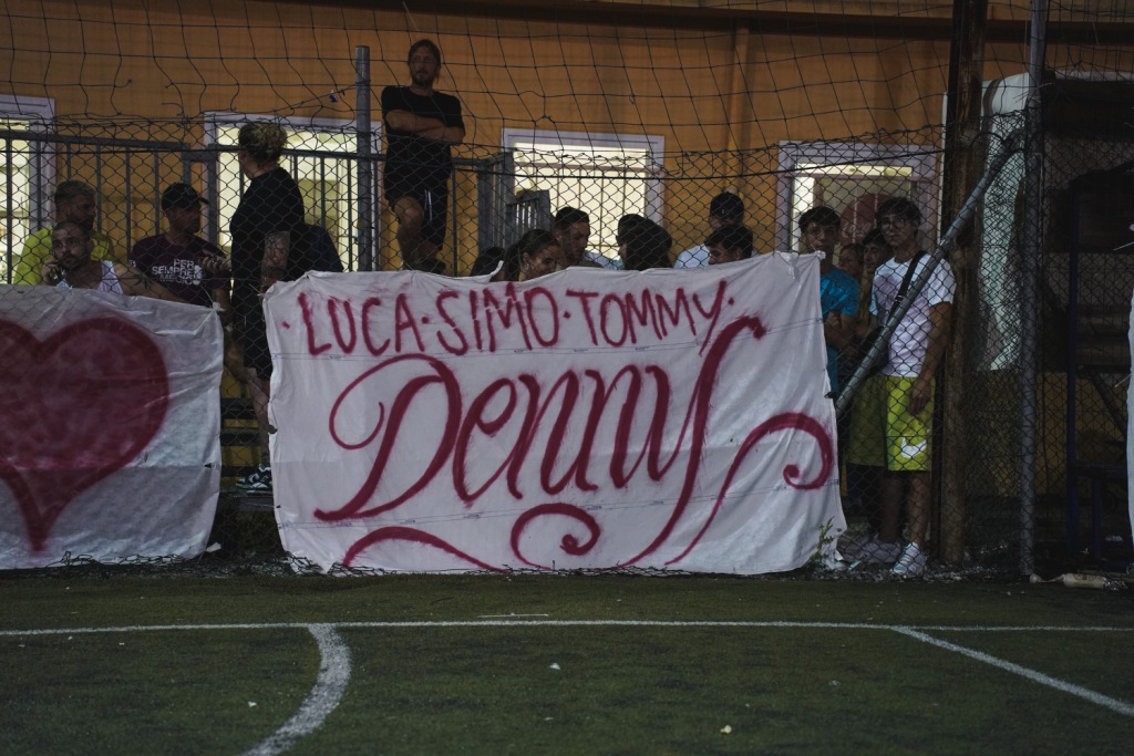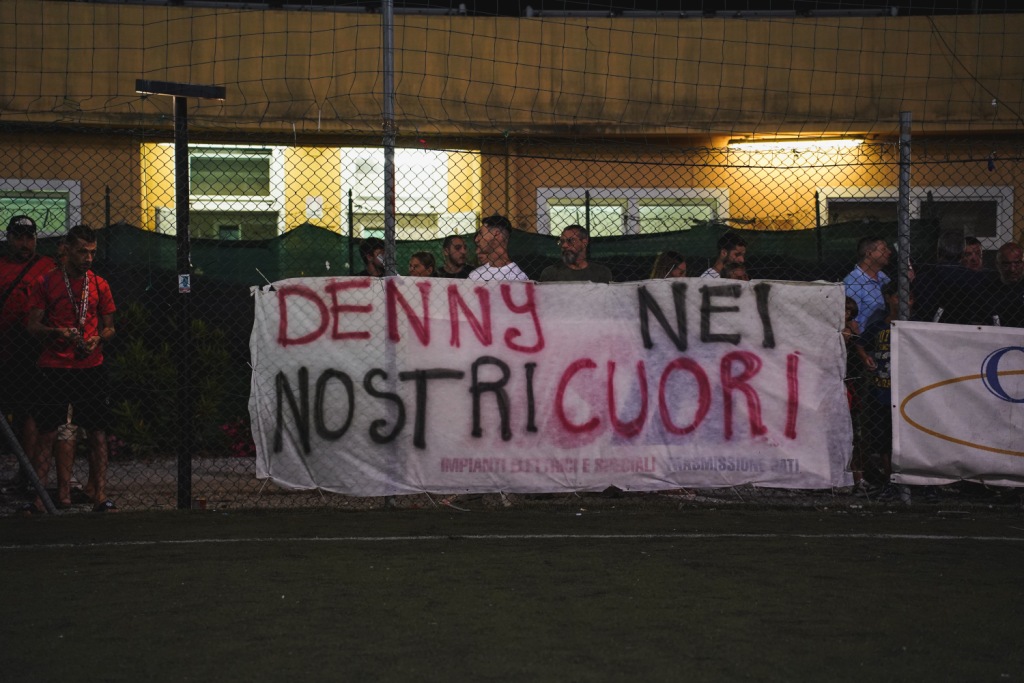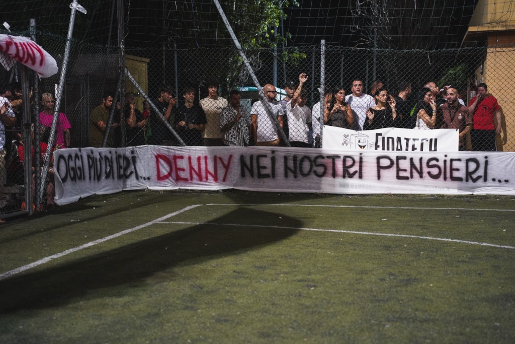 C’erano le stesse persone, se non di più forse della serata inaugurale, intorno al campo del Nuovo Centro Coteto per la serata finale del 1° Memorial Denny Magina. D’altronde sono state due serate, quelle del 23 maggio e del 22 giugno, significative non solo dal punto di vista del torneo ma anche e soprattutto dei sentimenti per i tantissimi amici presenti che, grazie alla coreografia allestita da Stefano Francalacci e Nicola Sighieri con il contributo di Noemi Gianmattei, Mirco Fabbrizzi e Cristiano Perciavalle e dei ragazzi del Memorial Mecio, hanno potuto ricordarlo con calore e colore. Tanti gli striscioni appesi intorno al campo (come in occasione della partita di esordio tra il Femmy United, la squadra di Denny nella quale gioca il padre Sky, e Ostriconda) come: “10 mesi senza il tuo sorriso, il tuo ricordo un amore condiviso”, “pensare che ancora vivi che da lassù ci guardi e sorridi” e “solo chi ha perso un amico sa cosa state passando. Il nostro dovere è ricordarlo”. “E’ stata una bella serata – racconta Stefano – abbiamo iniziato nel pomeriggio a preparare la coreografia. Ci aspettavamo tante persone ma non così tante, non c’era uno spiraglio d’aria a bordo campo. Visto l’ottimo riscontro speriamo di poterlo ripetere il prossimo anno. Sono fiero di essere stato coinvolto dalla famiglia nell’organizzazione del torneo e ringrazio tutti i ragazzi del Mecio, Nicola, Noemi, Mirco e Cristiano per l’aiuto. Per il resto che dire ci manca, mi manca Denny”. Al termine del minuto di raccoglimento chiamato dall’arbitro, dopo la presentazione della serata da parte di Gabriele Baronetto, e prima che le squadre cominciassero a giocare c’è stata la coreografia dei fumogeni; la batteria dei fuochi d’artificio invece è stata fatta partire a fine torneo, sulle note di We are the champions, al momento in cui è stata nominata la squadra vincitrice perché, per usare le parole di Stefano, alla fine è stata anche una serata di sport, di calcio. Così, come detto la squadra 1ª classificata del torneo è stata Real Bagnaia/Stagno, la 2ª il Benfica. Sono poi seguite le altre premiazioni: miglior portiere Sascha Toso (Benfica; miglior giocatore Andrea Garbini (Real Bagnaia/Stagno); capocannoniere del torneo Nico Landi (Mexico).