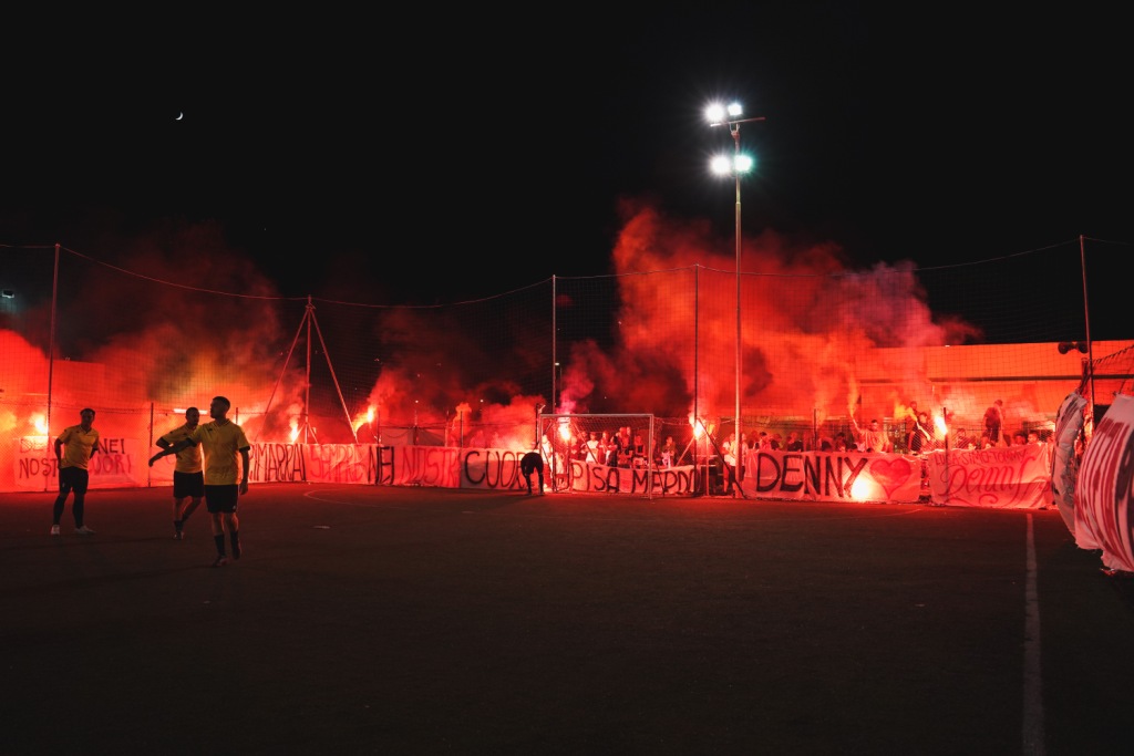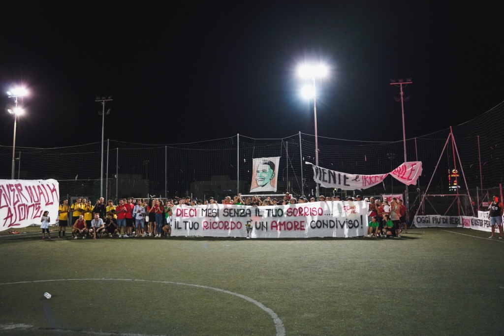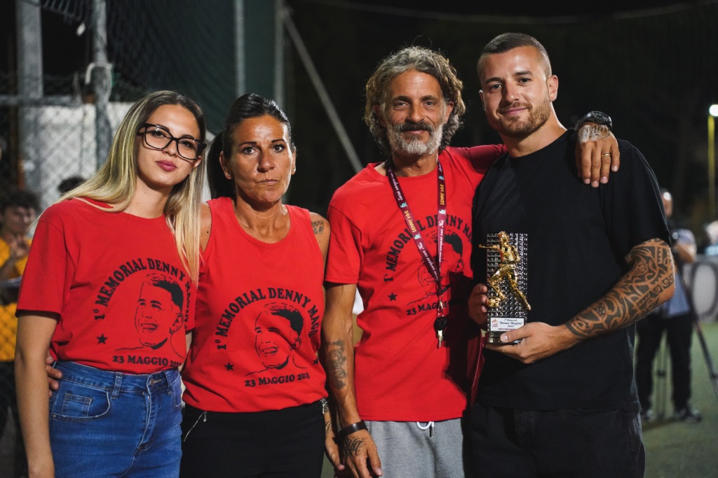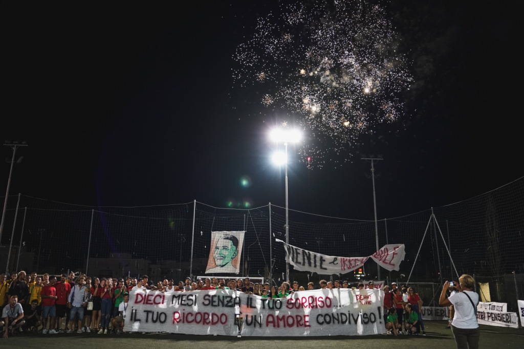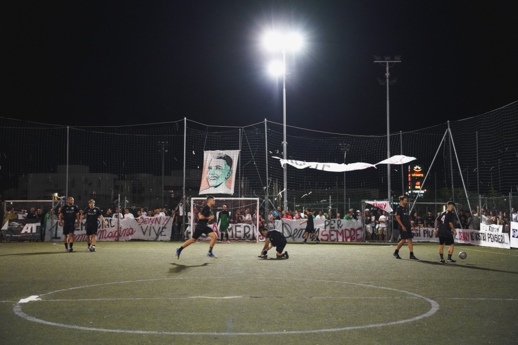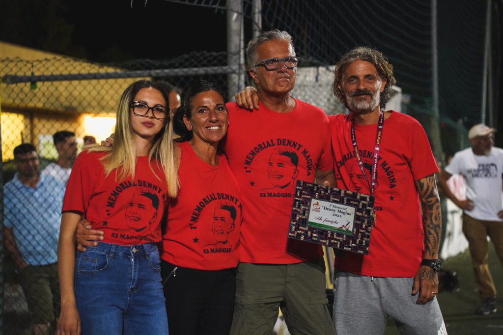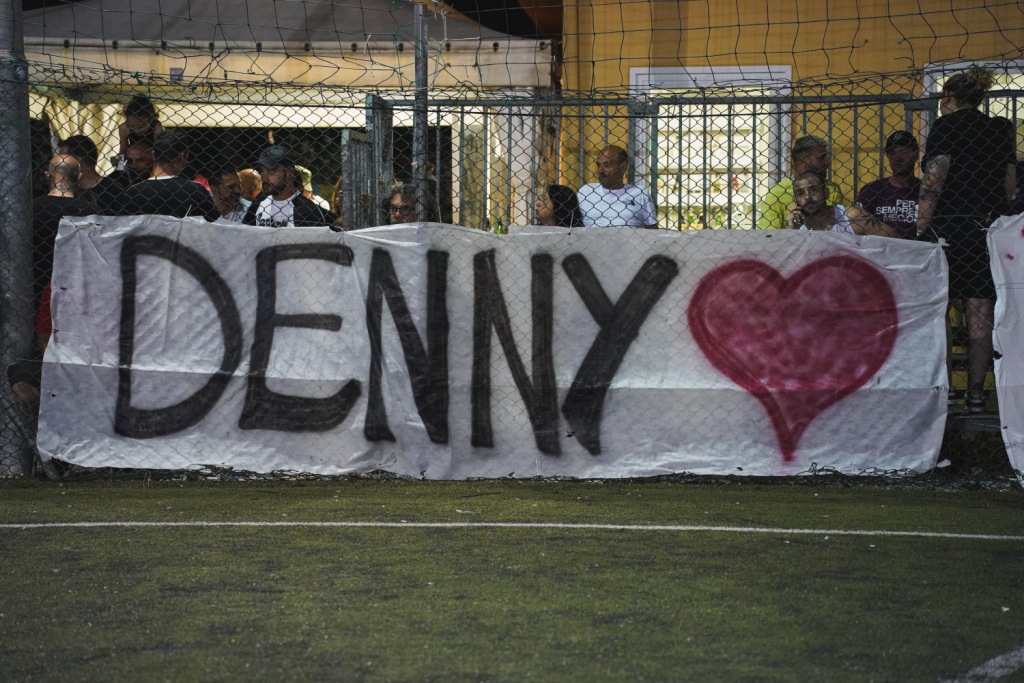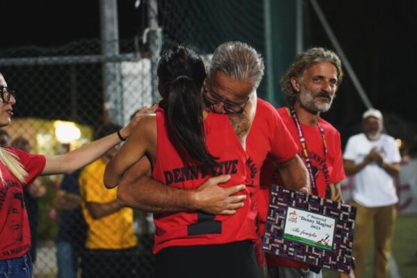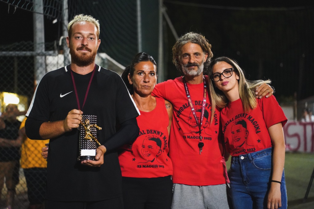 C’erano le stesse persone, se non di più forse della serata inaugurale, intorno al campo del Nuovo Centro Coteto per la serata finale del 1° Memorial Denny Magina. D’altronde sono state due serate, quelle del 23 maggio e del 22 giugno, significative non solo dal punto di vista del torneo ma anche e soprattutto dei sentimenti per i tantissimi amici presenti che, grazie alla coreografia allestita da Stefano Francalacci e Nicola Sighieri con il contributo di Noemi Gianmattei, Mirco Fabbrizzi e Cristiano Perciavalle e dei ragazzi del Memorial Mecio, hanno potuto ricordarlo con calore e colore. Tanti gli striscioni appesi intorno al campo (come in occasione della partita di esordio tra il Femmy United, la squadra di Denny nella quale gioca il padre Sky, e Ostriconda) come: “10 mesi senza il tuo sorriso, il tuo ricordo un amore condiviso”, “pensare che ancora vivi che da lassù ci guardi e sorridi” e “solo chi ha perso un amico sa cosa state passando. Il nostro dovere è ricordarlo”. “E’ stata una bella serata – racconta Stefano – abbiamo iniziato nel pomeriggio a preparare la coreografia. Ci aspettavamo tante persone ma non così tante, non c’era uno spiraglio d’aria a bordo campo. Visto l’ottimo riscontro speriamo di poterlo ripetere il prossimo anno. Sono fiero di essere stato coinvolto dalla famiglia nell’organizzazione del torneo e ringrazio tutti i ragazzi del Mecio, Nicola, Noemi, Mirco e Cristiano per l’aiuto. Per il resto che dire ci manca, mi manca Denny”. Al termine del minuto di raccoglimento chiamato dall’arbitro, dopo la presentazione della serata da parte di Gabriele Baronetto, e prima che le squadre cominciassero a giocare c’è stata la coreografia dei fumogeni; la batteria dei fuochi d’artificio invece è stata fatta partire a fine torneo, sulle note di We are the champions, al momento in cui è stata nominata la squadra vincitrice perché, per usare le parole di Stefano, alla fine è stata anche una serata di sport, di calcio. Così, come detto la squadra 1ª classificata del torneo è stata Real Bagnaia/Stagno, la 2ª il Benfica. Sono poi seguite le altre premiazioni: miglior portiere Sascha Toso (Benfica; miglior giocatore Andrea Garbini (Real Bagnaia/Stagno); capocannoniere del torneo Nico Landi (Mexico).