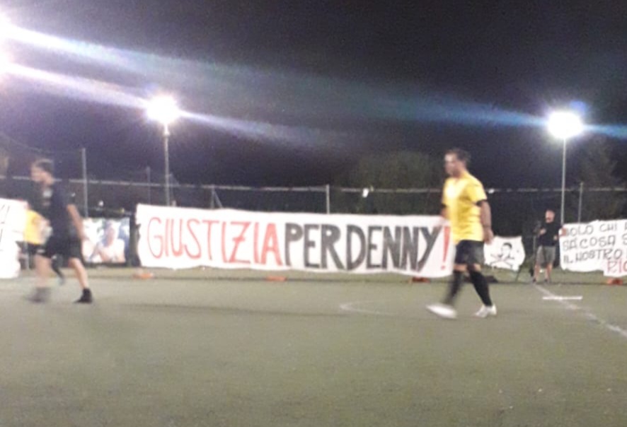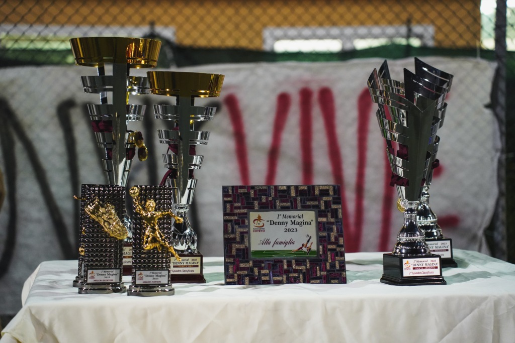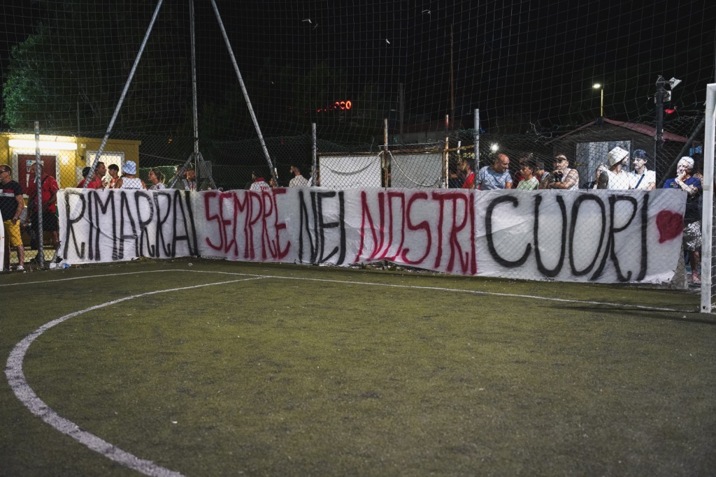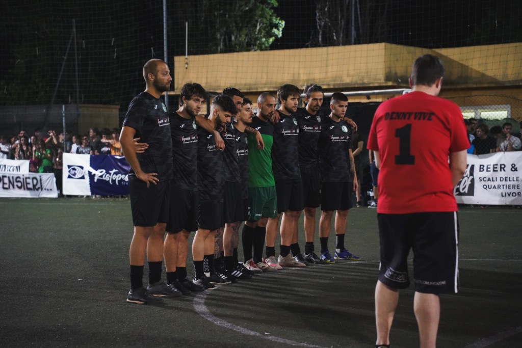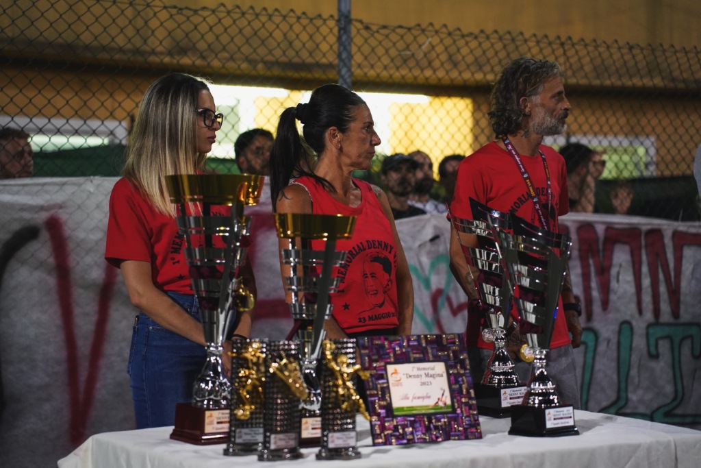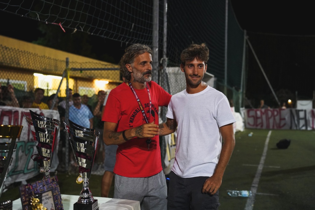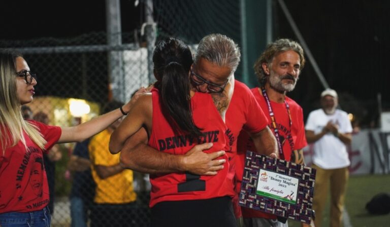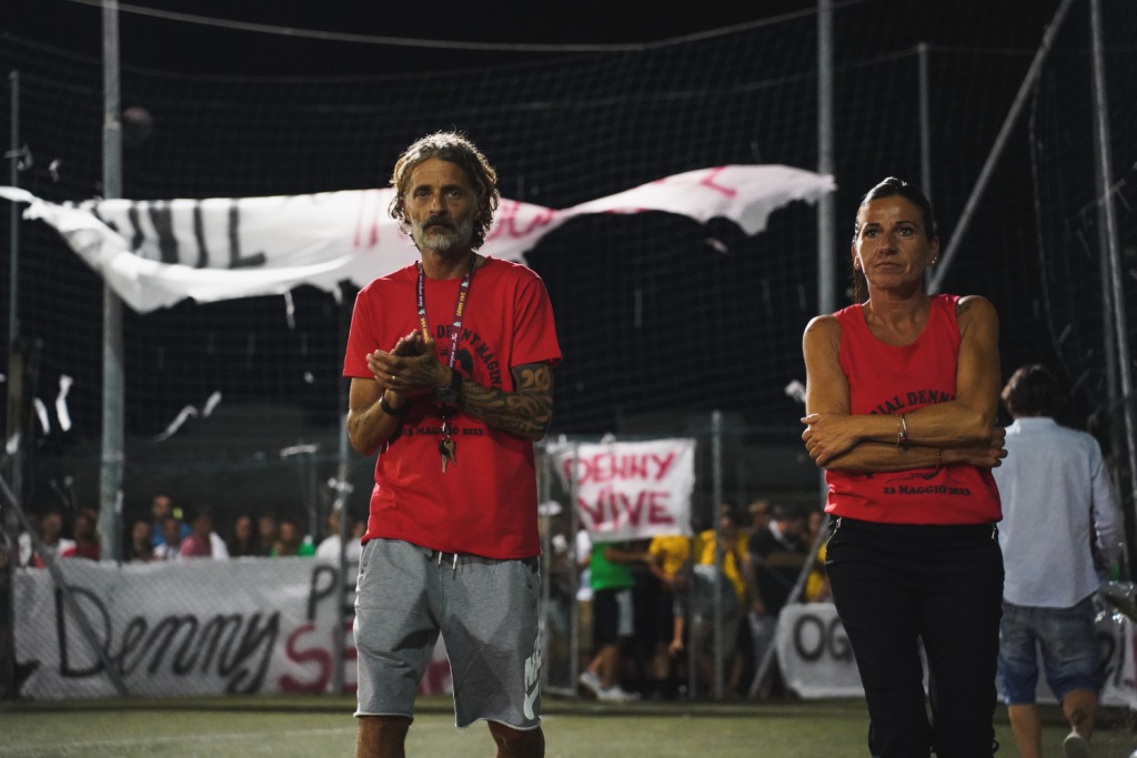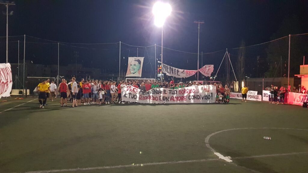 C’erano le stesse persone, se non di più forse della serata inaugurale, intorno al campo del Nuovo Centro Coteto per la serata finale del 1° Memorial Denny Magina. D’altronde sono state due serate, quelle del 23 maggio e del 22 giugno, significative non solo dal punto di vista del torneo ma anche e soprattutto dei sentimenti per i tantissimi amici presenti che, grazie alla coreografia allestita da Stefano Francalacci e Nicola Sighieri con il contributo di Noemi Gianmattei, Mirco Fabbrizzi e Cristiano Perciavalle e dei ragazzi del Memorial Mecio, hanno potuto ricordarlo con calore e colore. Tanti gli striscioni appesi intorno al campo (come in occasione della partita di esordio tra il Femmy United, la squadra di Denny nella quale gioca il padre Sky, e Ostriconda) come: “10 mesi senza il tuo sorriso, il tuo ricordo un amore condiviso”, “pensare che ancora vivi che da lassù ci guardi e sorridi” e “solo chi ha perso un amico sa cosa state passando. Il nostro dovere è ricordarlo”. “E’ stata una bella serata – racconta Stefano – abbiamo iniziato nel pomeriggio a preparare la coreografia. Ci aspettavamo tante persone ma non così tante, non c’era uno spiraglio d’aria a bordo campo. Visto l’ottimo riscontro speriamo di poterlo ripetere il prossimo anno. Sono fiero di essere stato coinvolto dalla famiglia nell’organizzazione del torneo e ringrazio tutti i ragazzi del Mecio, Nicola, Noemi, Mirco e Cristiano per l’aiuto. Per il resto che dire ci manca, mi manca Denny”. Al termine del minuto di raccoglimento chiamato dall’arbitro, dopo la presentazione della serata da parte di Gabriele Baronetto, e prima che le squadre cominciassero a giocare c’è stata la coreografia dei fumogeni; la batteria dei fuochi d’artificio invece è stata fatta partire a fine torneo, sulle note di We are the champions, al momento in cui è stata nominata la squadra vincitrice perché, per usare le parole di Stefano, alla fine è stata anche una serata di sport, di calcio. Così, come detto la squadra 1ª classificata del torneo è stata Real Bagnaia/Stagno, la 2ª il Benfica. Sono poi seguite le altre premiazioni: miglior portiere Sascha Toso (Benfica; miglior giocatore Andrea Garbini (Real Bagnaia/Stagno); capocannoniere del torneo Nico Landi (Mexico).