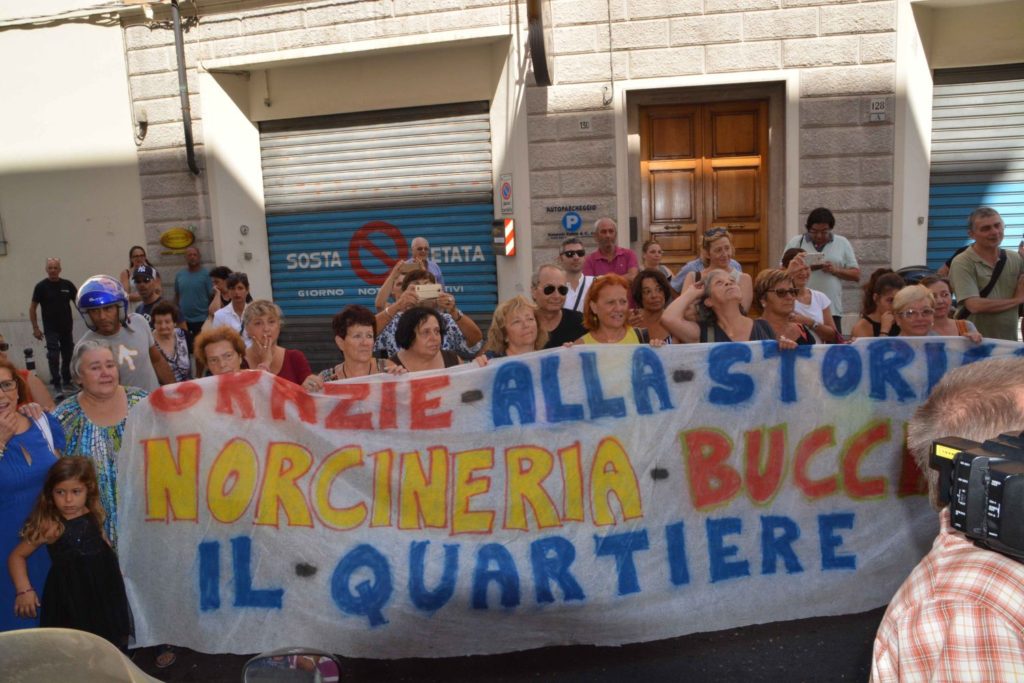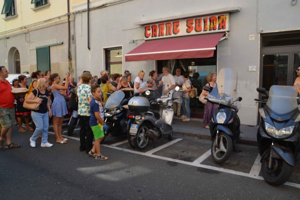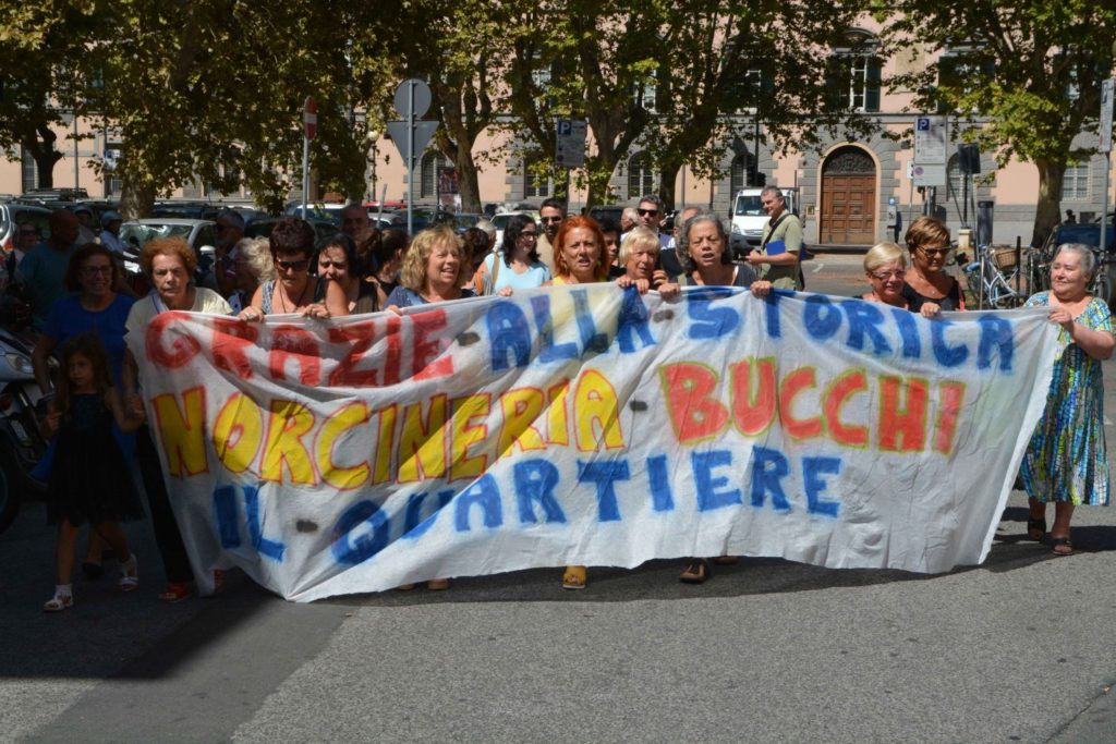I residenti della zona si sono organizzati per fare una festa a sorpresa alla Norcineria Bucchi di via Verdi e in corteo hanno raggiunto il negozio per consegnare ai norcini una targa e un libro fotografico