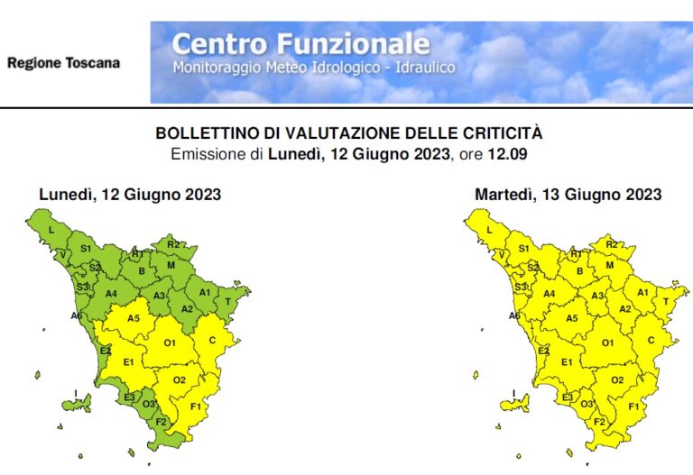 La Protezione civile regionale ha prolungato la validità del codice giallo in corso per possibili forti temporali e rischio idrogeologico idraulico del reticolo minore fino alla mezzanotte (ore 23.59) di mercoledì 14 giugno. L’avviso è valido per tutto il territorio della Toscana.