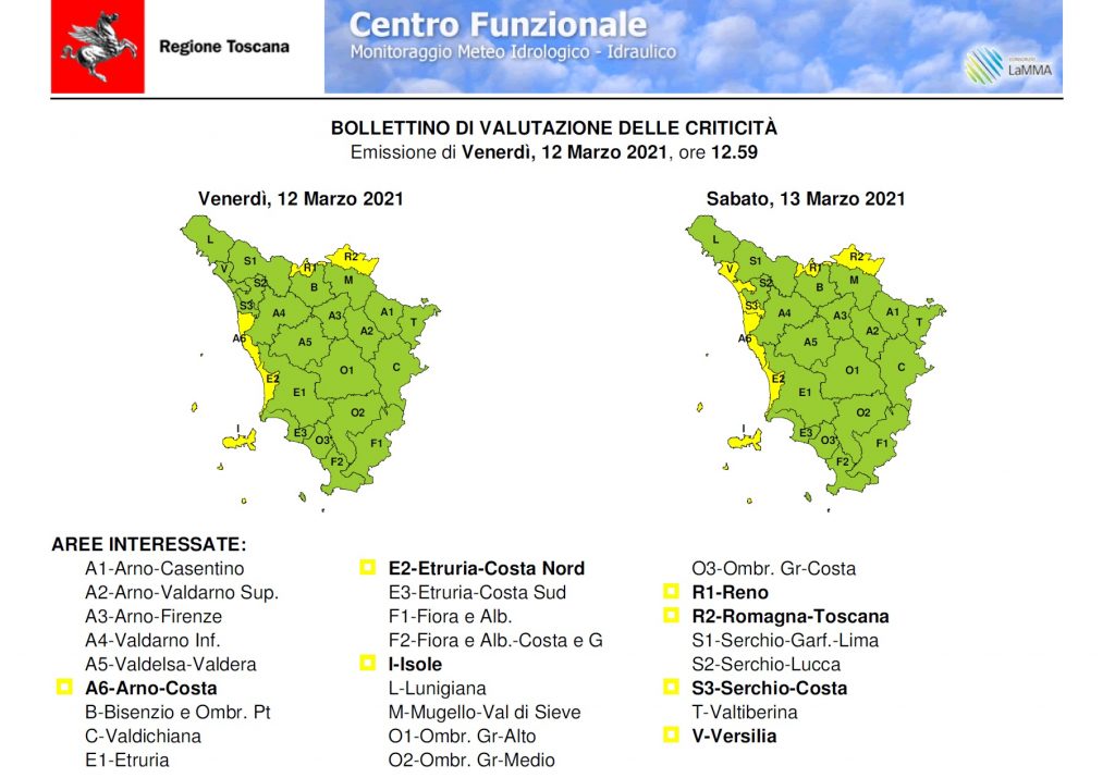 Il Centro Funzionale Meteo della protezione civile regionale ha emesso un avviso di criticità (codice giallo) per la possibilità di forti raffiche di vento di libeccio e mareggiate lungo le coste della Toscana centrale, compreso il territorio di Livorno e Gorgona. L’avviso è valido fino alle 3 di notte del 13 marzo e da sabato 13 alle 18 fino a mezzanotte.