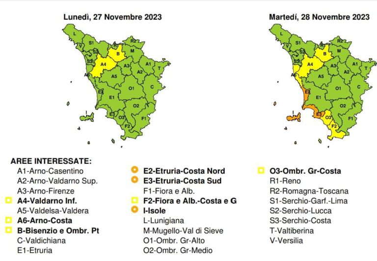 Per Livorno e Gorgona è previsto il codice giallo per rischio di forti raffiche di vento di ponente dalla mezzanotte alle ore 7 di martedì 28 novembre. Sempre per Livorno e Gorgona previsto anche il codice giallo per mareggiate dalla mezzanotte alle ore 18 di martedì 28 novembre. L’Amministrazione comunale raccomanda alla cittadinanza di seguire i consigli della Protezione civile, tra i quali quello rivolto soprattutto a pedoni e guidatori di mezzi a due ruote di evitare per quanto possibile il transito lungo i viali a mare.