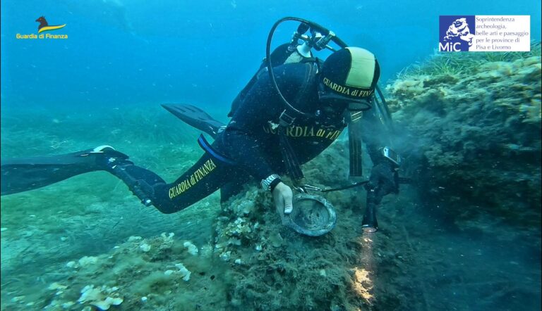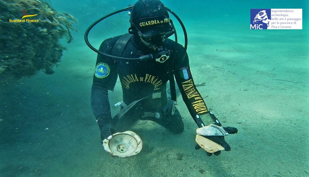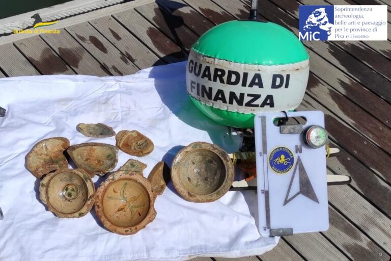 Ai sensi dell’art. 90 del D.Lgs. 22 gennaio 2004 nr. 42 “Codice dei Beni Culturali e del paesaggio”, il materiale oggetto del ritrovamento, a seguito di accurata georeferenziazione da parte dei militari operanti, è stato recuperato ed affidato alla competente Soprintendenza Archeologia Belle Arti e Paesaggio per le provincie di Pisa e Livorno per la catalogazione e per gli approfondimenti necessari a comprendere la natura e la provenienza dei manufatti. Da una prima analisi da parte del personale specializzato della Soprintendenza, il materiale rinvenuto dai Sommozzatori della Stazione Navale della Guardia di Finanza di Livorno, risulta risalire al XIII secolo e, nel dettaglio, trattasi di scodelle in ceramica graffita arcaica savonese. L’operazione di Polizia si inserisce nell’ambito delle molteplici attività istituzionali che il personale della Stazione Navale, sotto il coordinamento del Reparto Operativo Aeronavale labronico, esegue quotidianamente a tutela degli interessi economici finanziari dello Stato, del patrimonio archeologico e, più in generale, nella prevenzione e repressione degli illeciti perpetrati sul mare.