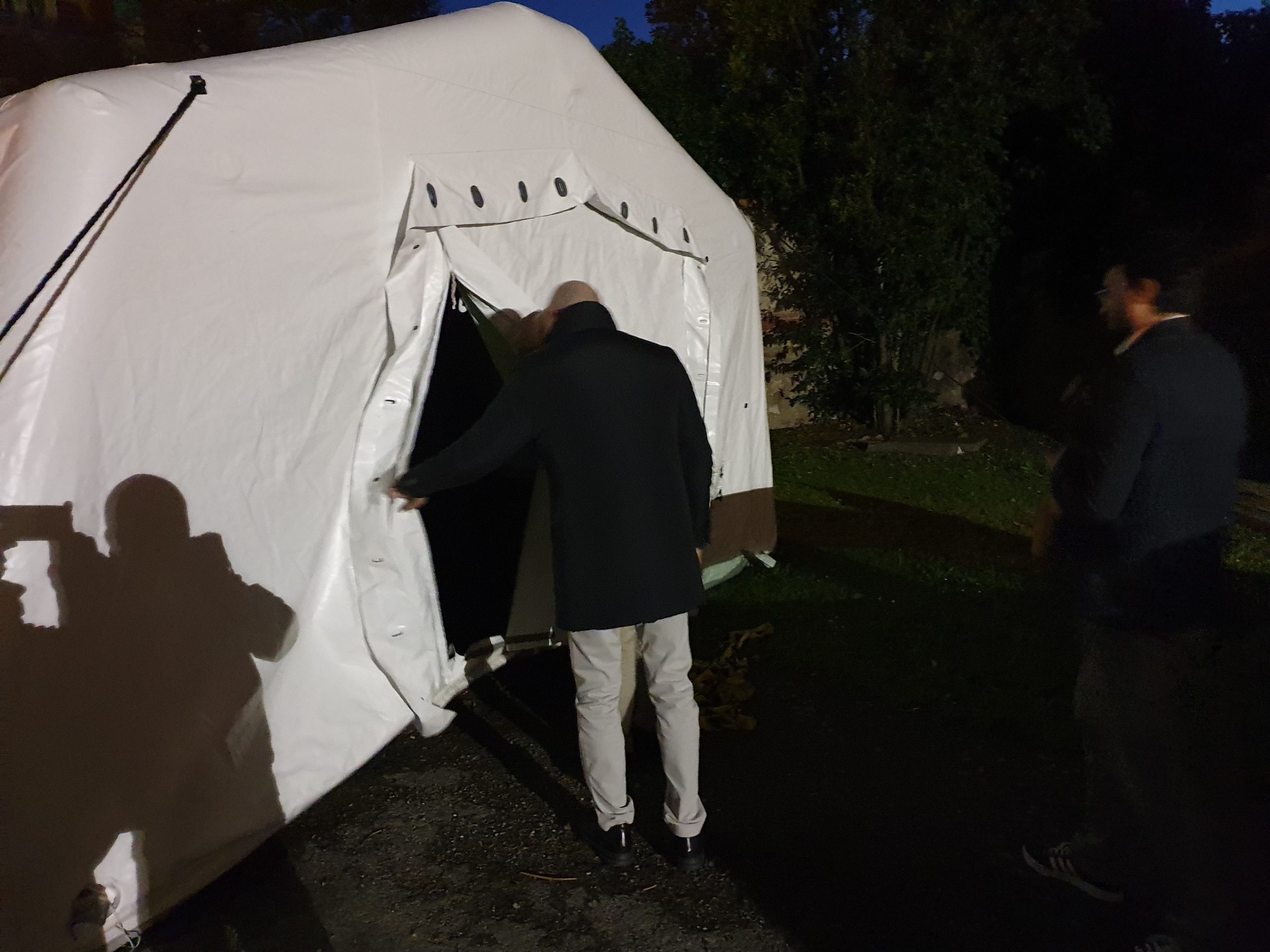 Tenda – “Sarebbe stato sbagliato fare il pre-triage con una tenda lontana dal pronto soccorso. La tenda infatti non è stata possibile installarla vicino al pronto soccorso poiché verrebbe fatta volare dalle eliche degli elicotteri che atterranno sulla elisuperficie presente proprio sopra al pronto soccorso”.