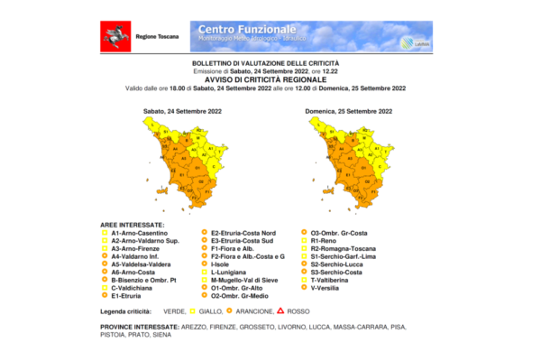 La Sala Funzionale della Protezione Civile regionale ha confermato la situazione di criticità per possibili forti temporali con rischio idrogeologico idraulico del reticolo minore e ha rivisto da giallo ad arancione il codice di allerta dalle 18 di sabato 24 alle ore 12 di domenica 25 settembre. Quindi, fino alle ore 18 del 24/9 codice giallo per possibili forti piogge associate a venti di scirocco, dalle ore 18 allerta arancione per possibili intensi rovesci temporaleschi e venti dai quadranti meridionali in intensificazione.